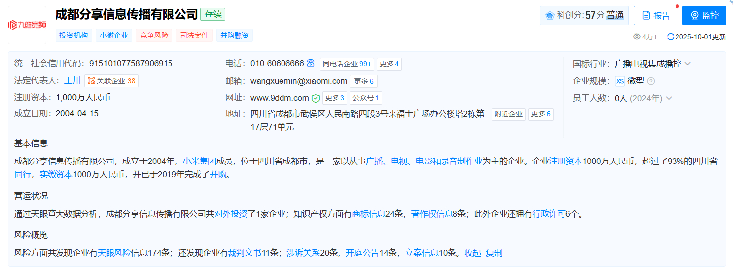 天眼查信息显示,成都分享信息传播有限公司成立于2004年,是小米集团成员,法定代表人为小米科技联合创始人、高级副总裁王川,注册资本为1000万元。