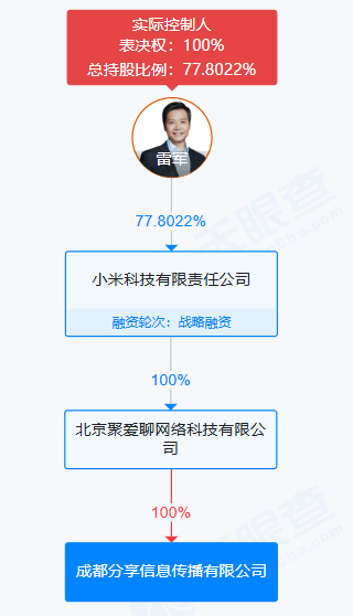 股权穿透信息显示,该公司由北京聚爱聊网络科技有限公司100%持股,后者则由小米科技有限责任公司全资持有。