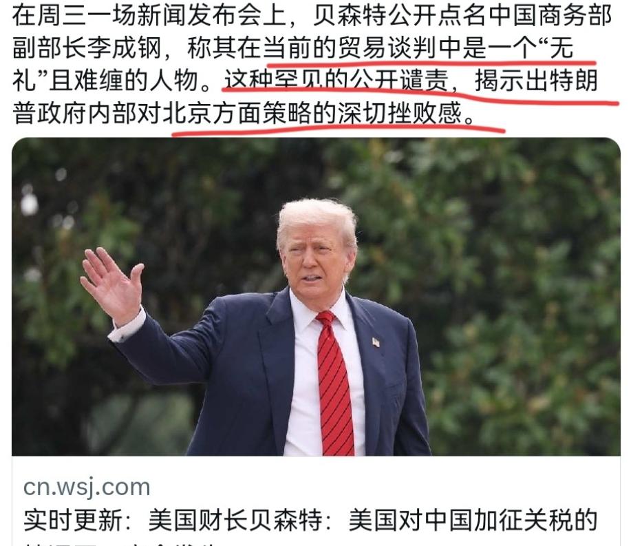 现在很好奇,我们的李成钢副部长到底对美国说了什么,以至于美国财长贝森特专门开一个记者会以粗鄙的语言攻击我们的李成钢副部长!贝森特这种攻击我们谈判代表的失礼行为,连美国媒体也看不下去,认为这说明特朗普团队在应对中国时遭遇到了巨大的挫败感。 李成钢副部长的身份是中国商务部的一位重量级对外谈判官员,长期负责涉及中美经贸的实质性磋商。 他在国际舞台上的发言,不是情绪输出,更不会是临场发挥,而是经过缜密准备、反复斟酌的政策表达和战略传递。 李副部长在与美方交涉过程中,持续强调了“平等互利、公平合理、以规则为基础”的原则立场,并明确指出“单方面施压、泛化国家安全概念、以国家安全为借口限制对华投资和技术交流”的做法已经严重破坏全球产业链稳定。 而就在这番言论发布后不久,美国财长贝森特便召开了记者会,对外“表达强烈不满”,用词之激烈,甚至被美国媒体评论为“失格的情绪宣泄”。 这并不是贝森特首次在对华议题上情绪化回应,但这次的反应明显更大,背后的原因很可能是因为李副部长的话不仅击中了美方的政策短板,更揭露了其所谓“去风险化”背后的实际动机。 当前美国大力推动对华科技脱钩、限制关键领域投资,表面上说是“保护国家安全”,实际上却是试图通过行政力量维持其在全球供应链中的主导地位。 李副部长在发言中对这种做法予以了正面回应,指出其“违反世贸组织基本原则,伤害了全球贸易秩序”,这显然让美方难以接受。 一位副部长的理性发言,居然能让一国财长跳脚,这恰恰说明中国的声音已经越来越有分量。 过去中国在国际谈判中常被动解释、消极应对,而现在,中国不仅敢于讲出真实立场,还敢于指出对方的问题,这种变化,是中国综合国力增强、制度自信增强的表现。 而美方的“强烈反应”,某种意义上是一种外交焦虑的体现。特别是在当前美国国内面临诸多经济难题、通胀压力不减、制造业回流受阻的大背景下,中美经贸关系的稳定对他们来说至关重要。 更让人玩味的是,美国媒体并没有一边倒地支持自家财长。包括《纽约时报》《华盛顿邮报》在内的多家主流媒体都在报道中指出,贝森特的发言“缺乏外交分寸”,甚至在某些评论中称其“情绪失控,不利于美方形象”。 这说明问题已经不仅仅是中美之间的观点分歧,而是连美国内部都开始反思:是不是我们在处理对华事务中,情绪太多,策略太少?是不是我们太急于“压制中国”而忽略了全球经济的正当规则和合作期待? 从长期来看,中美在经贸领域的交往不可能完全脱钩,也不可能保持长期对抗。中国始终主张通过对话解决分歧,用合作取代对抗,用共赢取代零和。 李成钢副部长在发言中提到,“中国欢迎任何基于平等和尊重的经贸合作”,这句看似平淡的话,实际上释放出非常清晰的态度:中方不怕谈,更不怕吵,但谈判要有底线,也必须有规则。 反观美方,如果继续用施压和指责代替协商和妥协,恐怕只会让局势更加紧张,最终伤害的还是全球经济的稳定。 我们应该看到这件事背后的意义:中国谈判代表越来越有力量,也越来越有底气了。 面对任何不公正、非理性的做法,中国不再沉默,而是通过理性、专业、有力的方式进行回应,这才是国际话语权真正提升的体现。 未来我们还会看到更多这样的场景,看到更多像李副部长一样的专业人士,在国际舞台上坚定地为国家发声。这不是一场口水战的胜利,而是战略定力和政策逻辑的胜利。