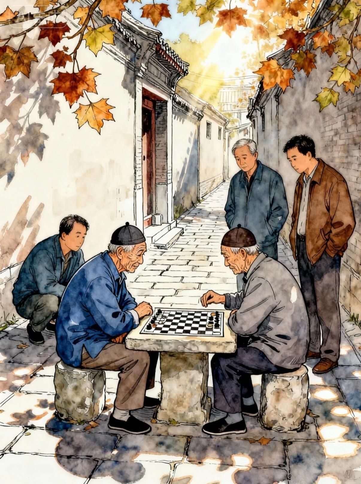 每日午后两点左右 单元门前的小花园便热闹起来 老榆树的浓荫下 七八位退休老先生围坐石桌旁 在楚河汉界间排兵布阵 他们的对弈自有章法 一局结束自觉换人 观棋者静坐不语 只闻落子声 偶尔为一步好棋赞叹 或因失误轻声争论 爽朗笑声如石子投入静湖 漾起圈圈涟漪 三米外的另一石桌旁 五六个大妈边织毛衣边唠家常 张家长李家短的趣事伴着笑声随风飘散 听三楼的贾姐说 这些老人多是退休教授 生活规律而充实 上午去公园散步 午休后准时来此对弈 直至天黑才依依不舍散场 从春末到深秋只要天晴 这小花园便是他们的乐园 望着他们 我不禁心向往 等到我退休后也这般悠闲 与志趣相投的伙伴共度从容时光 在喜好中安放余生 该有多惬意 这般晚年不仅是岁月的静好 更是时光沉淀后的从容与智慧