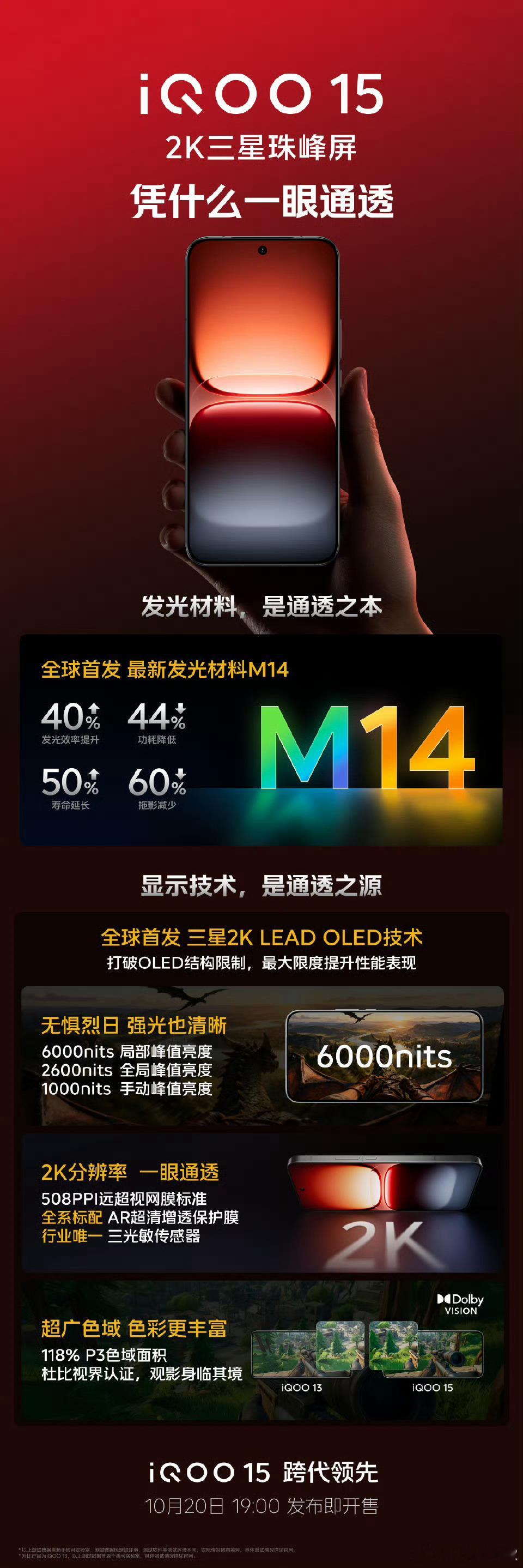 iQOO15这块2K三星珠峰屏全球首发三星2KLEADOLED显示技术,可以