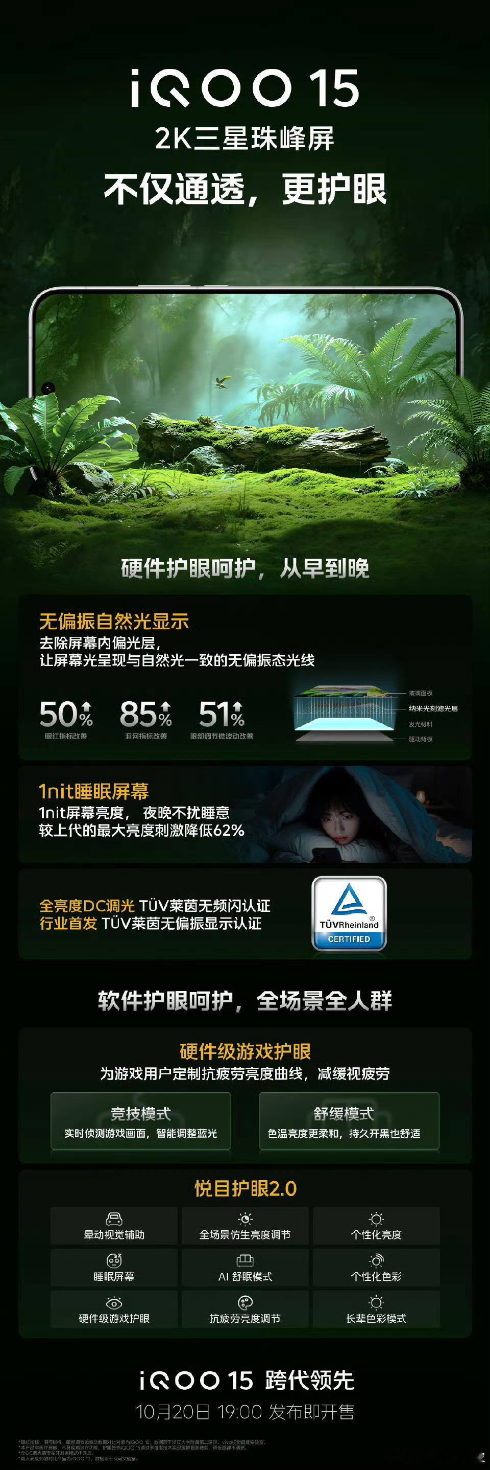 iQOO15这块2K三星珠峰屏全球首发三星2K LEAD OLED显示技术,可以去除了屏幕内偏光层,新增纳米光刻滤光层,实现类似自然光的显示,显示效果和护眼效果大幅提升[666]并且屏幕功耗相比传统面板降低近40%,2K屏的实际耗电可能比别家1.5K还低。同时还实现了高亮度与广色域的结合,色彩还原量提升21%,能更好地呈现AI驱动的3D视觉效果。怎么说呢,期待iQOO 15的表现!
