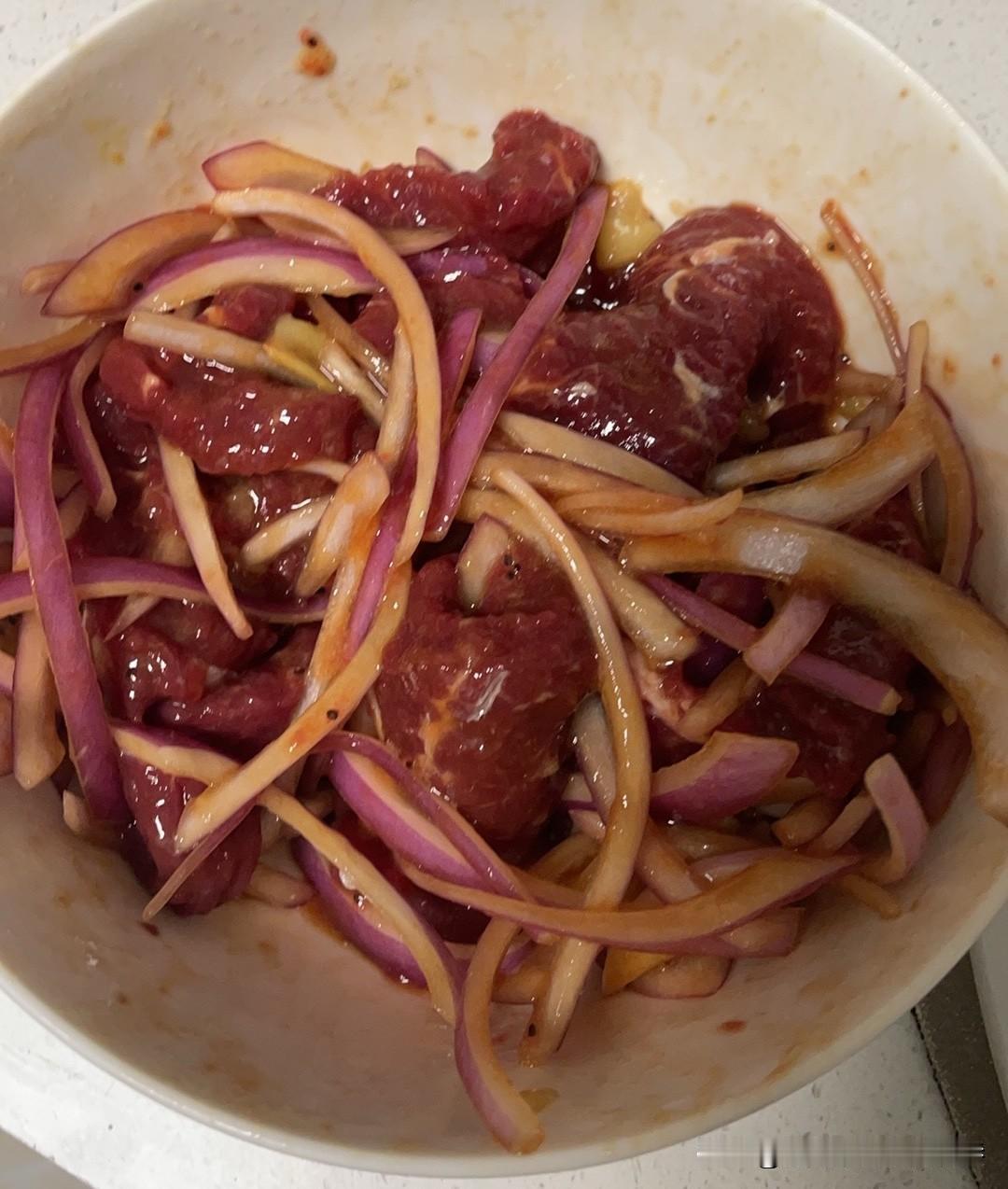 《今天的烟火气》 下班回到家,系上围裙钻进厨房,把牛肉切成薄片,紫皮洋葱细细切丝,和姜片、酱料拌在一起,看它们在碗里渐渐裹上诱人的酱色。窗外的天色慢慢暗下来,厨房里飘着洋葱的辛香和肉的鲜味,这是属于平凡日子的温暖。等会儿热油一炝,滋啦声响里,便是一家人围坐餐桌的期待——或许这就是生活,在一菜一饭的烟火气里,把奔波的疲惫,都融成了餐桌旁的笑语。