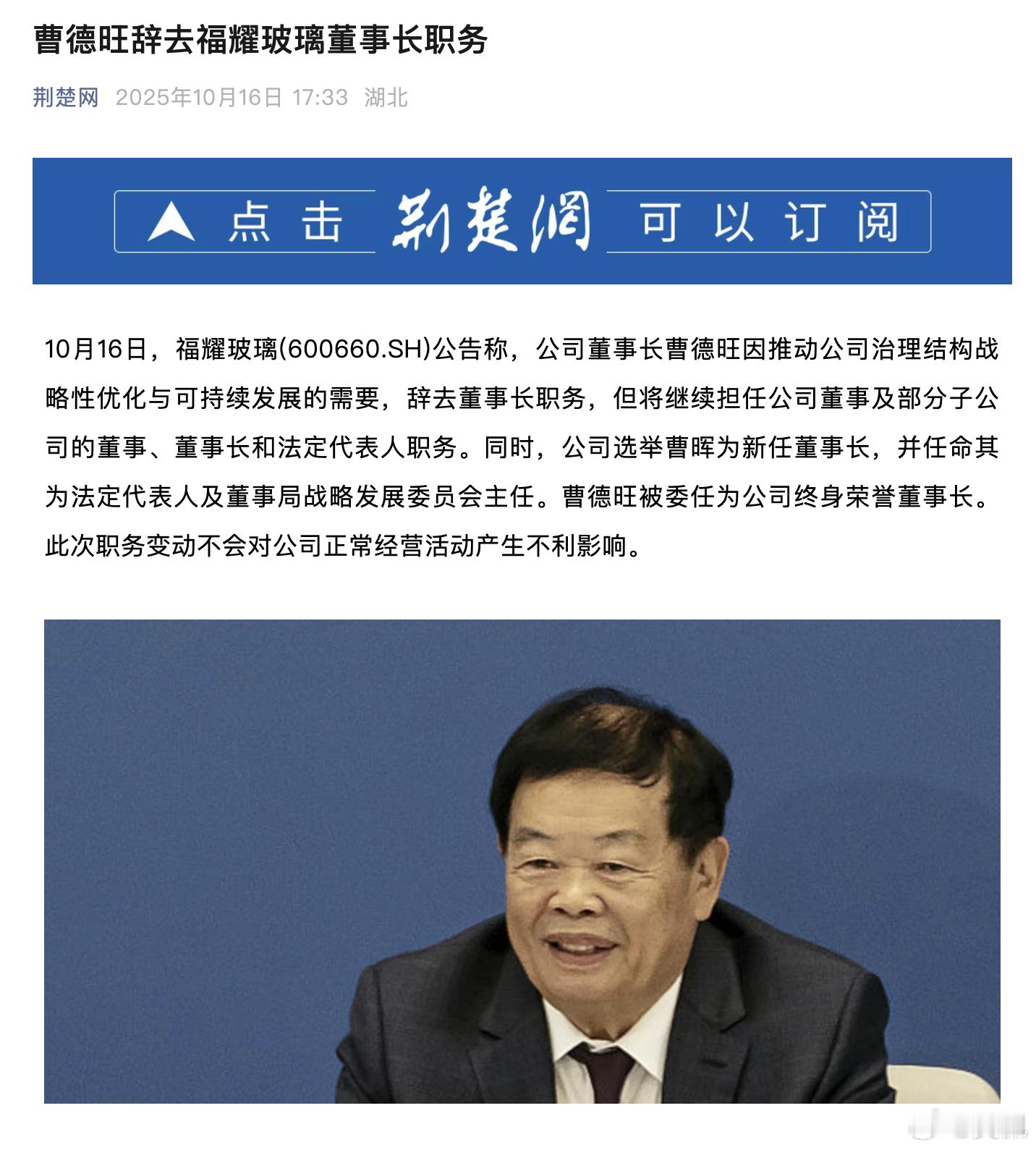 曹德旺辞去福耀玻璃董事长职务。
