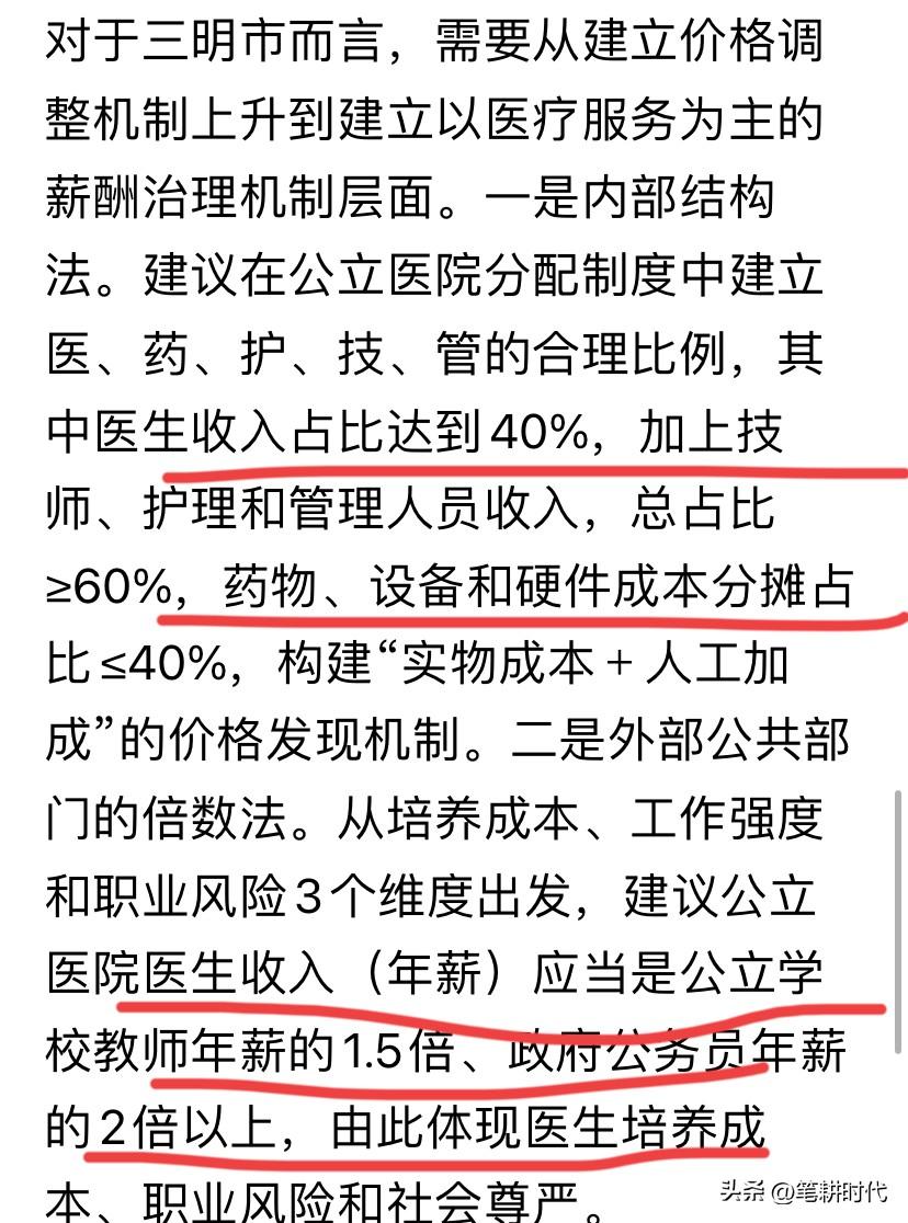 医生的年薪得是公立学校教师的 1.5 倍,政府公务员的 2 倍以上。还有些科室绩效有优待。足足给了我一颗定心丸。 医院内部的绩效分配往儿科、传染病科、检验科,还有紧缺岗位等方向倾斜。 就等具体落地时间。医生在全世界都是一等一的高薪职业。要是再不提高薪资,面对性价比低的医学,愿意学医的学霸将会越来越少。 医学生录取分数高、培养周期长、医生职责重大,赚钱比公务员都低,实在说不过去。 一个本科毕业生刚考进公务员,年薪也有十来万吧,一个医学硕士生刚毕业进医院工作,每月薪资可能是几千吧。 因为医生工作时间长,无节假日,风险大,值夜班几乎要到第二天中午。上个夜班,下夜班要查完房才得回去睡觉,查完房整清楚又过了半天。夜班最能消耗人的体能精力。 无论是学历、培养周期、工作强度还是责任风险,是其他职业无法比拟的,关键是还要面临医患矛盾。 我家有医学生一枚,正读研二,之前还建议儿子等到读研三考跟医学相关的单位,并非当医生不可。跟公务员等相比,性价比明显低。 这个提议,也体现付出与收获的对等性,似乎给我吃了一颗定心丸。瞬间提高了医生的价值。