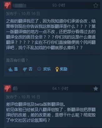 据不少玩家反馈,此翻译把一些之前翻译看的过去的地方改差,差的地方更差,并且新简体中文修改了之前很多Boss名称,新简体中文翻译引发了玩家抨击。