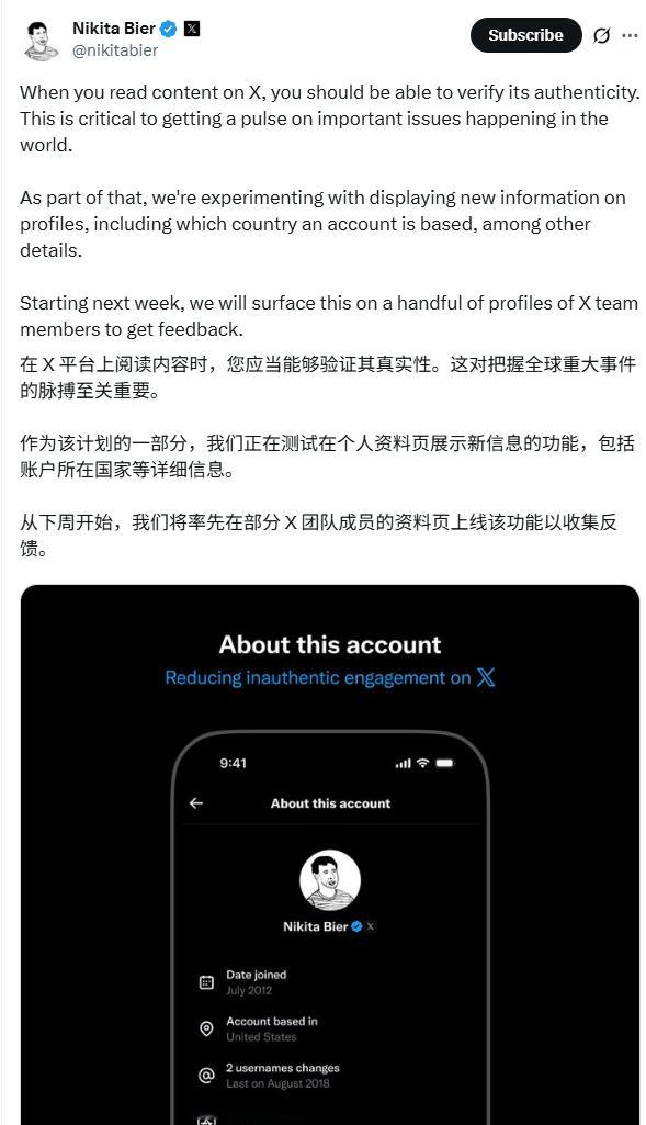 测试阶段仅会显示账号当前所在的国家或地区(例如“美国”、“日本”),不会涉及具体IP或更精确的地理位置信息。