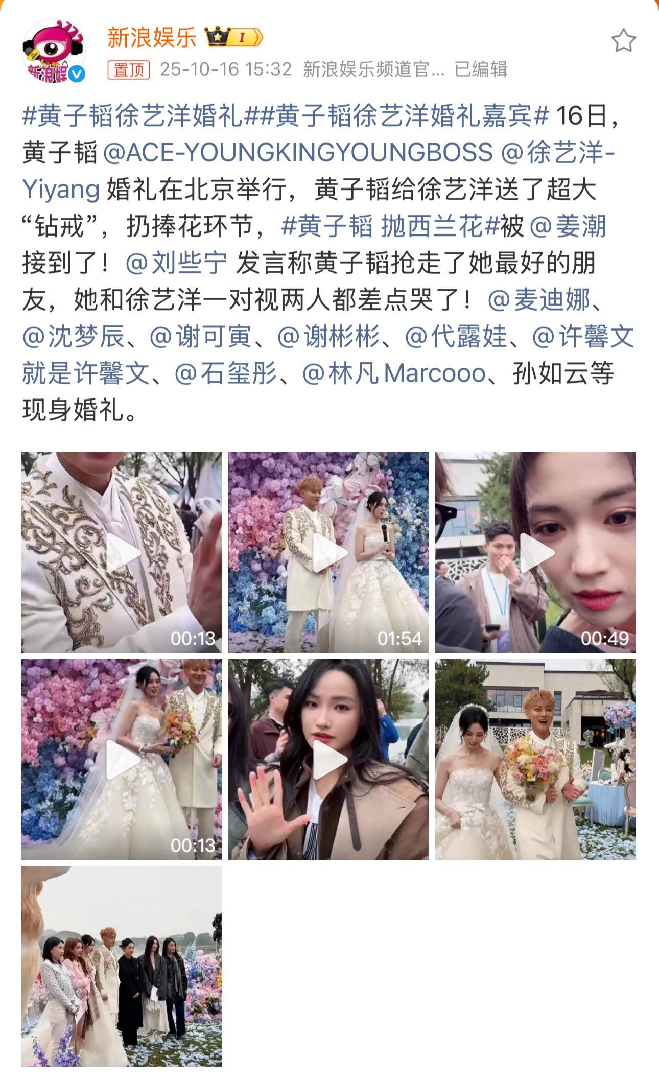 黄子韬徐艺洋婚礼黄子韬和徐艺洋今天终于办婚礼了!他俩从官宣、求婚、领证再到婚礼,这个婚结了快两年!