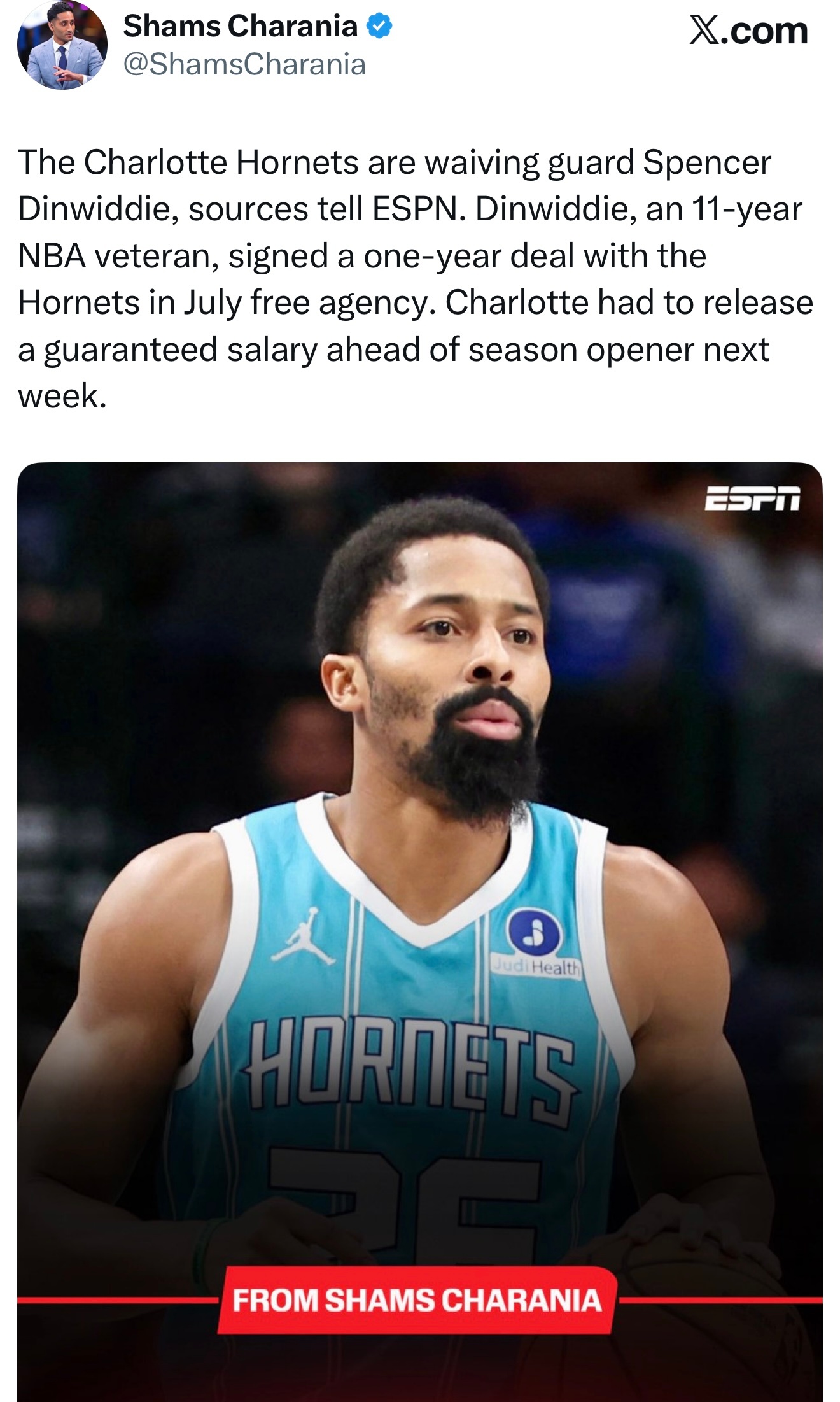 Shams:夏洛特黄蜂队裁掉后卫丁威迪。