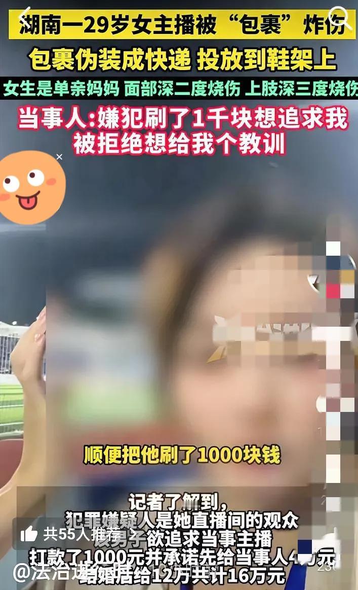 刷1000块就想追女主播?被拒后竟寄“炸弹包裹”,这男的疯得太吓人! 湖南永州29岁单亲妈妈女主播,就因为拒绝了一个刷了1000块礼物的男粉丝追求,对方竟把包裹伪装成快递,让她脸部深二度烧伤、上肢深三度烧伤。这男的还扬言给16万求交往,被拒后就说“给你个教训”,甚至骚扰她粉丝找住址。 现在嫌犯是抓了,但这事儿细想真让人后背发凉。网络世界里,有些人把打赏当“购买”,被拒就发疯使坏,这哪是追爱,分明是拿暴力当控制欲的遮羞布。 你说,这种畸形的网络“求爱”,是不是得狠狠治治?