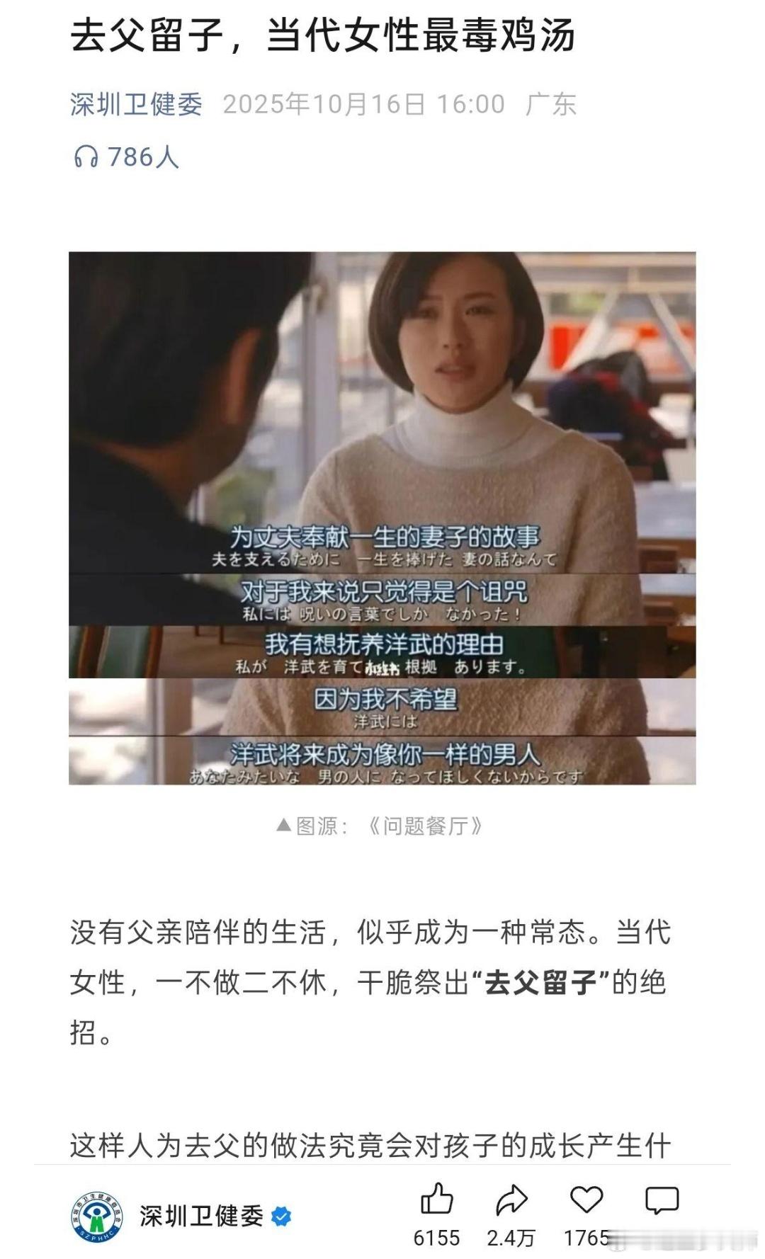 深圳卫健委文章:《去父留子:当代女性最毒鸡汤》每天摸鱼打卡