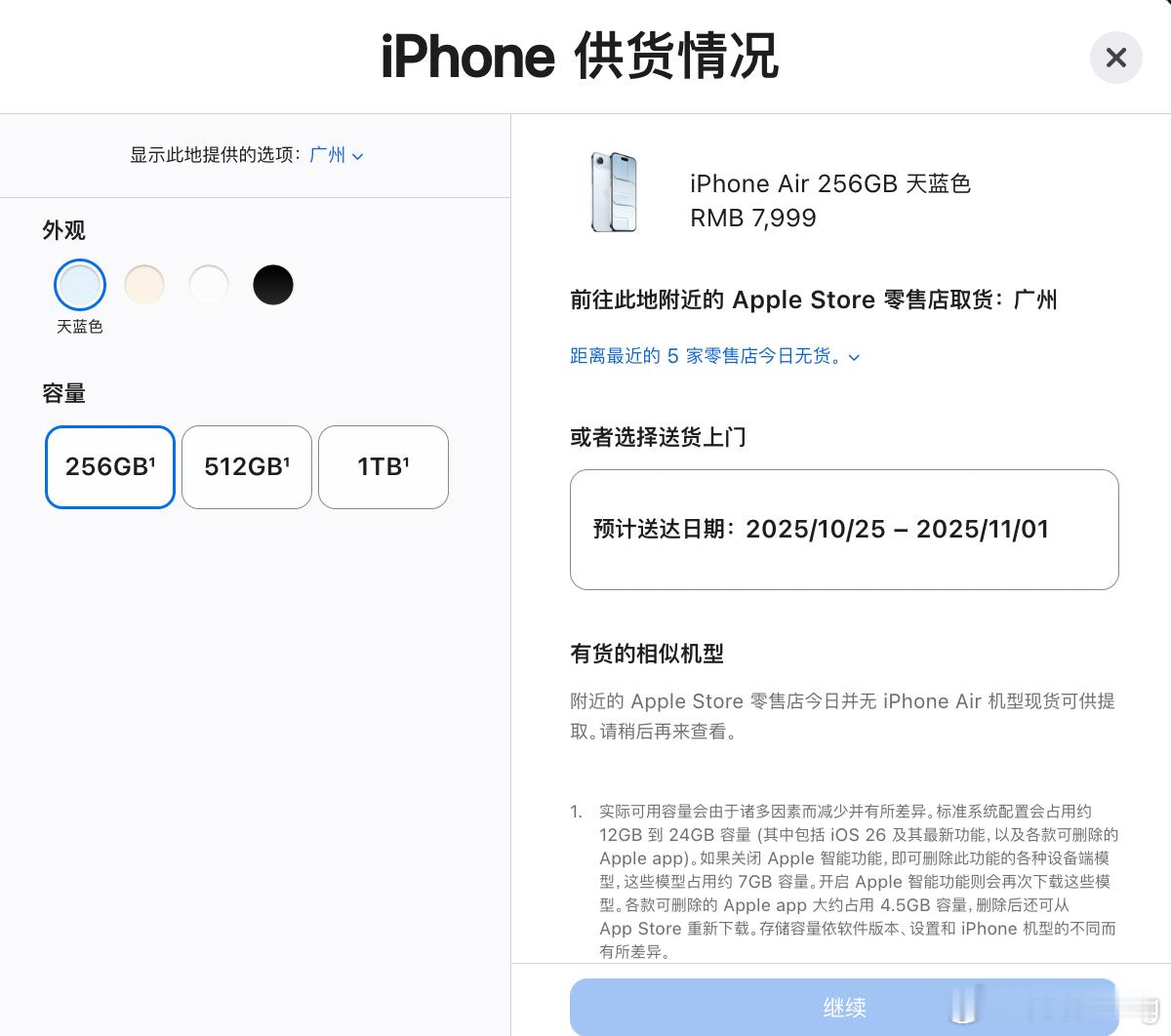 iPhoneAir今天终于开售,看了下官网首批到店取货全部没有了,快递最早要1