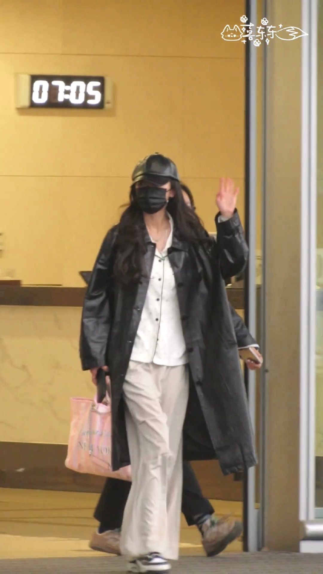 杨幂睡衣外搭黑大衣look,满分休闲服造型,是连轴转的幂姐,归国路透状态也是满分的元气啊,欢迎回家,好好休息呀!