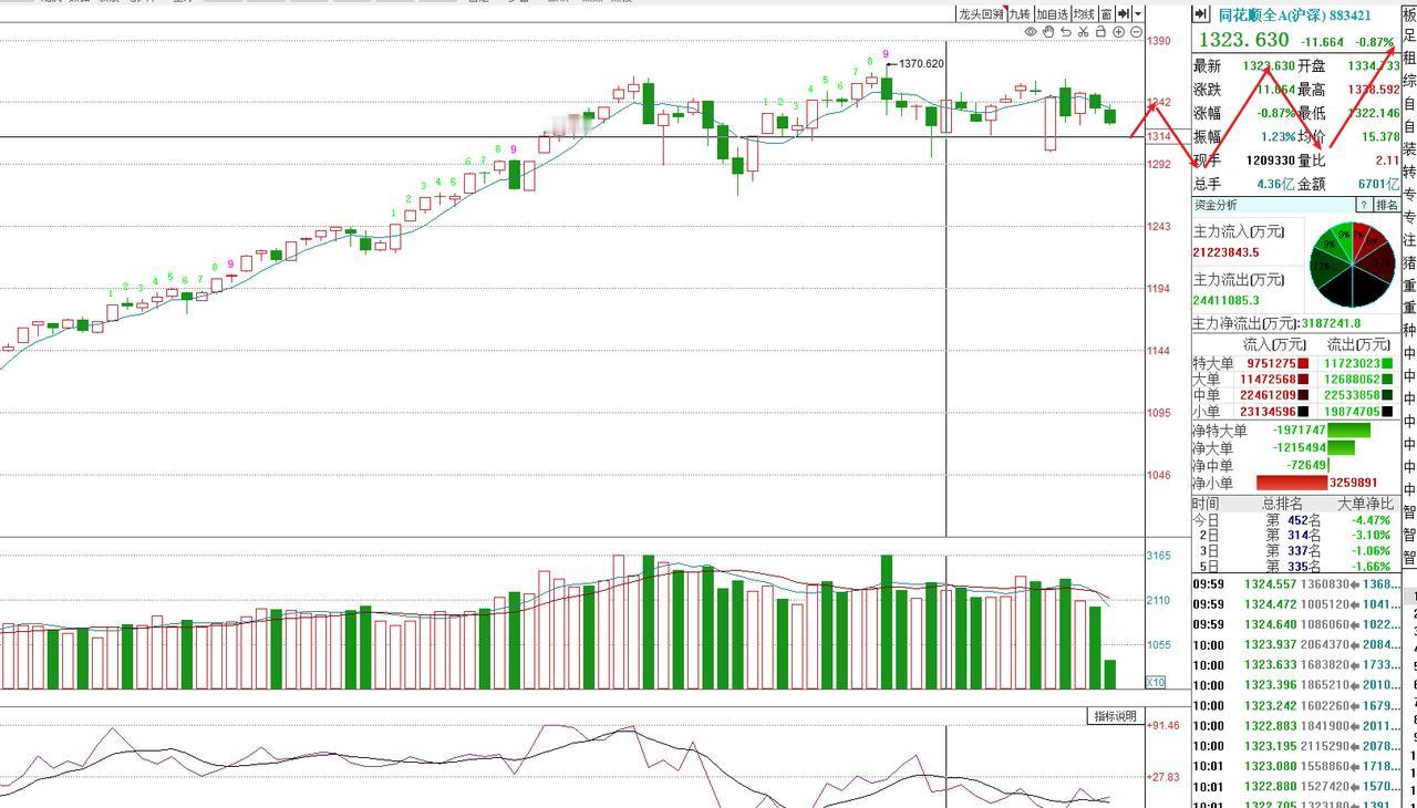 今日一步到位,最早下午就有短线机会了,最迟下周初,就看能不能一步到位! 本周的诱多是明显的,叠加大幅度缩量,跌的同时,几乎没啥对冲板块,主要还是银行保险护盘,这又加重的盘面的整体调整。所以本周较为煎熬! 好在下一周短线反弹小波形就要来啦! 今日同花顺全a的平均价指数跌1.2%-1.5%,基本可以认为见底了。 然后下周进行反抽,反抽量能基本不抱多大希望,增量3000亿以内就可以了。 反抽结束要试探9月23日的低点,然后起一波超百点的行情。 这里机会更大,增量更明显。 10月份就是指数宽幅震荡,板块分化加剧,轮动加快的,有出货,有建仓,所以会有诱多也会有洗盘,对于散户来说是煎熬的,但就是这种煎熬才会酝酿牛市初期的第二批拉升。