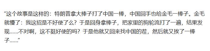 网上看到一个段子,就是下面截图中的描述,说实话,挺有才的,虽然是段子,但的确把这次中美博弈的真实情况写了出来!很多人说,为什么美国每次都是关税大棒,截图中的段子,给出了很好的答案。确实,美国的大棒,打在所谓盟友身上,十分好使,一打一个不吱声,最终都把贸易协议签了,最终都妥协了。但是美国终究忘记了,打狗的方式,放在人身上,自然无效!