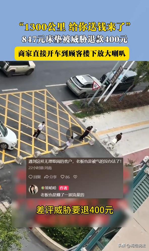 安徽芜湖,男子的网店有客户下单了一张847元的床垫,收到货后客户直接申请了退款并差评,事后还拿差评威胁,要额外退款400元才肯删掉差评。男子暴脾气一下子上来了,不远千里从佛山赶到客户楼下后,拿着喇叭大声循环:7栋2单元某业主在我店铺买了847元床垫后恶意退款,还拿差评威胁额外退400元,我现在开车1300公里送钱来了! 大象新闻十月十五号报道了这则男子的网店遭遇客户恶意退货后,最后用了“一招伤敌一千自损八百”的方式维权的新闻,事情的经过是这样的。 刘某是经营家具专卖的,也有自己的网店,按理说他什么样蛮不讲理的客户都见过了,但最近网店一个客户的行为,还是彻底的惹怒了他。 当时客户下单了一个847元的床垫,这个是店里的热销款,因为质量好加上款式新颖,一直都卖的不错,收到货的客户反馈都不错。 要知道同样的款式在线下得卖上千,但在网上销售没有租金等成本,加上刘某为了做口碑,好需要更多的回头客,这款床垫主打一个性价比。 这次的客户收到货后,二话不说就给了个差评。 刘某以为是运输途中出现了损坏,忙联系客户,表示如果因为快递的原因造成损坏,是可以免费更换的。 接下来客户的回复直接惹怒了刘某:要退回差评可以,额外给我退400块就行。 一看这架势刘某就知道遇到了白嫖党,要知道这张床垫虽然卖了847元,但刨去成本后基本不赚什么钱了,要是再退回400元,那这单还要赔本了。 刘某开网店多年,自认为各种各样的奇葩客户是见了不少,可这么欺负人的客户还是第一次碰到,一根烟的功夫后刘某做了个大胆的决定。 刘某先是找了个大功率喇叭,提前录了一段话:X小区7栋2单元某业主在我店铺买了847元床垫后恶意退款,还拿差评威胁退400元,我现在开车1300公里给你送钱来了! 准备好后刘某根据顾客的收货地址,确定了对方的位置,虽然导航显示有1300公里,开车的话得14个小时,可气急的刘某顾不上这些了,交代好家人后,一脚油门就出发了。 经过长途跋涉刘某终于抵达了客户所在的小区,来不及休息的他拿出提前准备好的喇叭,音量调到最大后,就开始循环播放之前的录音。 这么大的动静很快引起了小区居民的围观,大家一听录音的内容,就知道是怎么一回事了,纷纷私底下议论了起来。 对于大家的指指点点刘某充耳不闻,既然你不仁,就别怪我无义了。 那么,从法律角度,如何认定这件事呢? 1、如何评价客户恶意差评的行为? 根据《消费者权益保护法》第十五条规定,消费者享有对商品或服务的监督权,包括发表评价,但应基于真实消费体验,内容客观公正,不虚构事实或恶意贬损。 任何消费者在基于真实的消费体验,可以合理的给出自己的主观评价,不管是好评还是差评,但必须建立在客观公正的基础上,如果以差评为手段,来谋取不正当利益,就超出了合理评价的范围,违反了上诉规定。 此外,根据《消费者权益保护法》第四条规定:“经营者与消费者进行交易,应当遵循自愿、平等、公平、诚实信用的原则。 刘某作为经营者,提供了高质量的床垫,客户在交易时,也应遵循平等、公平、诚实信用的原则,如果为了谋取不当利益故意差评,就要承担相应的法律责任。 2、客户将可能受到怎样的处罚? 《治安管理处罚法》第四十九条规定:“盗窃、诈骗、哄抢、抢夺、敲诈勒索或者故意损毁公私财物的,处五日以上十日以下拘留,可以并处五百元以下罚款;情节较重的,处十日以上十五日以下拘留,可以并处一千元以下罚款。 客户以取消差评为由,索要400元的补偿,其行为构成了敲诈勒索,可最高处以十日拘留,并处罚金;如果事后正式差评对刘某网店的正常销售造成了影响,客户还将承担更大的赔偿责任。 3、如何评价刘某的行为? 根据《民法典》第一千零二十四条规定:民事主体享有名誉权,任何组织或者个人不得以侮辱、诽谤等方式侵害他人的名誉权。 如果能证实客户的恶意差评具有诽谤性,并损害了刘某的商业信誉,他依法有权要求对方停止侵害、消除影响、恢复名誉,并赔偿相应经济损失。 此外,根据《民法典》第五百七十七条规定:当事人一方不履行合同义务或者履行合同义务不符合约定的,应当承担继续履行、采取补救措施或者赔偿损失等违约责任。 客户和刘某的买卖行为也构成了正式合同关系,针对客户恶意差评的违约行为,刘某也有权要求对方承担相应的违约责任。 对于客户的行为,你有什么看法呢?