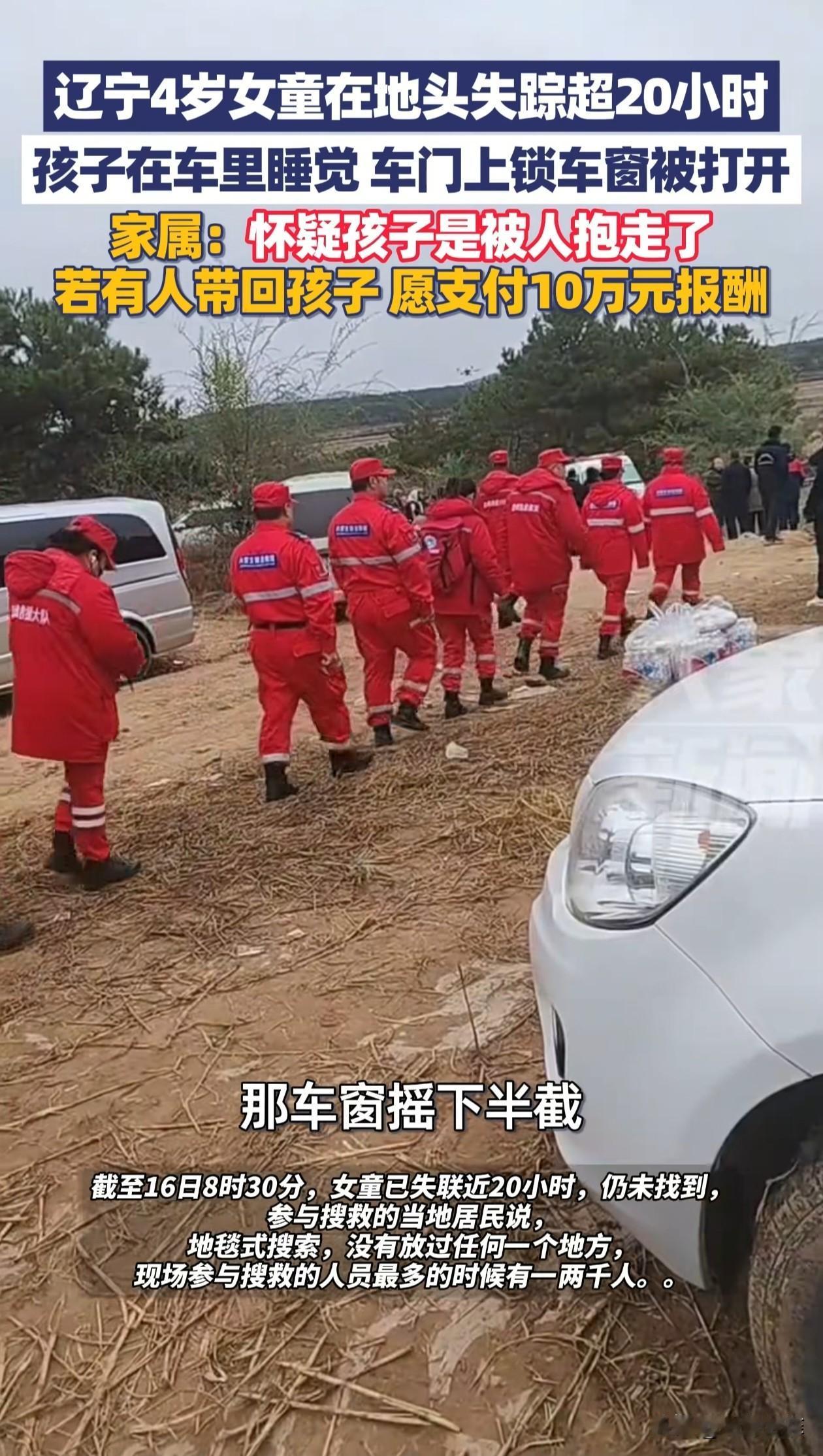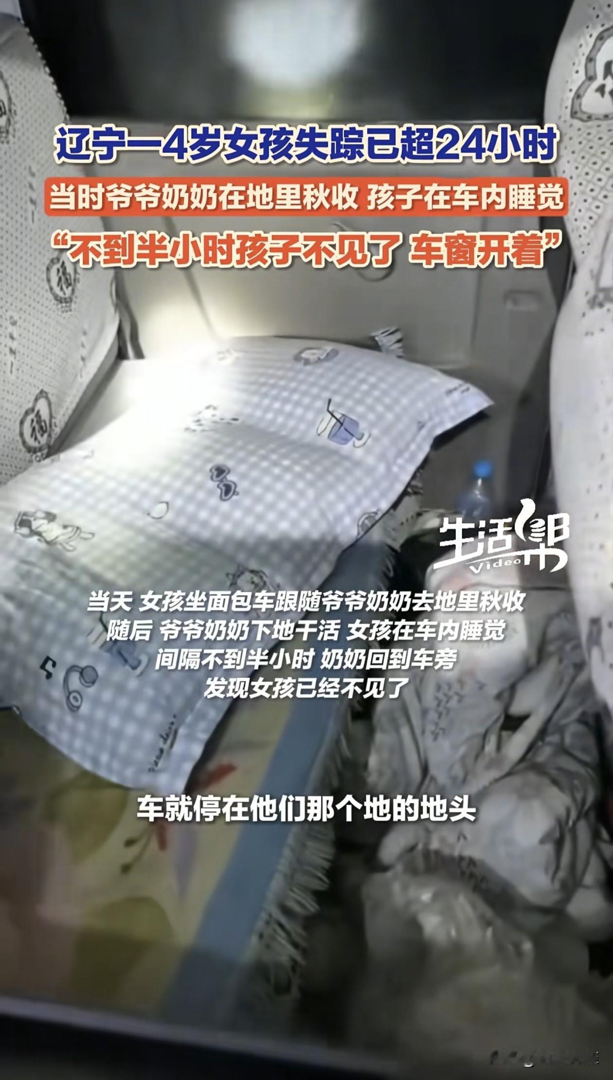 爷爷奶奶开着面包车,带3岁孙女去山上的地里收庄稼,孙女留在车里睡觉,爷爷再返回去看时发现孙女失踪,车门没开,但原本关着的车窗被摇下来一半。爷爷:怀疑孩子是在睡着时被抱走的。 辽宁,3岁小女孩平时跟着爷爷奶奶生活,爸妈在外地打工。当天爷爷奶奶开着面包车带着孙女到地里干活,看见孩子睡着了,就把她留在了车里。 爷爷特意关好车门,留了点车窗缝透气,然后和老伴去200米外的地里干活,中间没有遮挡物,能看到车子。 大概过了20分钟,爷爷回去车旁边看了一眼,孩子还在睡,又过了半小时爷爷再回来看,却发现车里的孩子不见了,车门没开,但原本关着的车窗被摇下来了一半。 爷爷说,孩子才3岁多,面包车的车窗得手动从里面摇,这么小的孩子自己摇下来的可能性特别小,而且孩子要是醒了肯定会哭,他们在附近干活应该能听到,怀疑孩子是在睡着的时候被人抱走的。 奶奶很着急,哭着说孩子是自己一手带大的,是她的命根子,愿意倾家荡产换孩子回来。 孩子爸妈接到消息后,赶紧从外地赶了回来,发布了寻人启事,当地专业救援队和村民都来帮忙寻找孩子,参与人员达上千人。 目前孩子已经失踪超过33小时,搜救还在继续,大家都在盼着能有好消息。 有网友理解农忙时老人可能顾不过来,但也有网友认为,不管在什么情况下,都不该将年幼的孩子单独留在车内,家长应该时刻保持警惕。 希望能尽快找到孩子,让她平安回到家人身边。