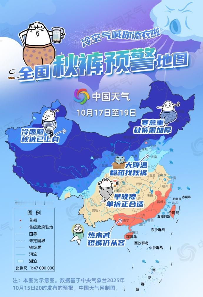 目前,今年下半年来最强冷空气过程已经上线,今起四天(10月16日至19日)将横扫我国中东部,大部地区陆续迎换季式降温。降温过后,北方寒意加重,南方暑热退场。@中国天气 推出全国秋裤预警地图,暖心喊你穿秋裤。网页链接