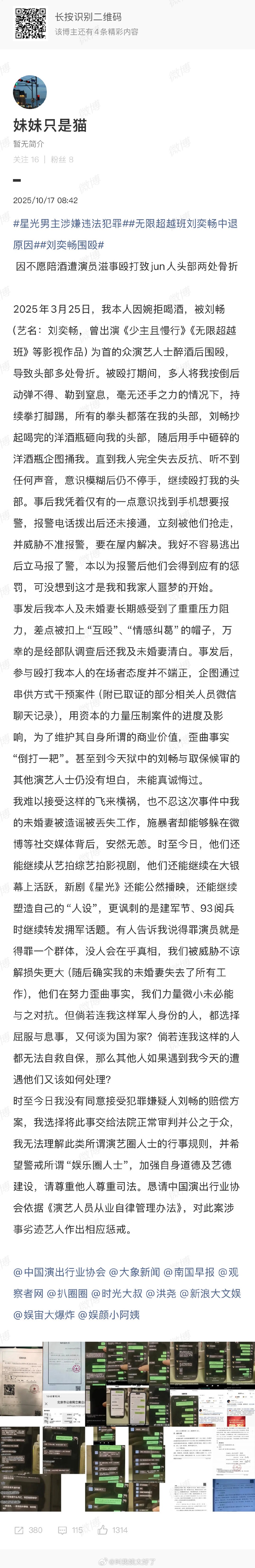 网友“妹妹只是猫”爆料自己因为婉拒喝酒被刘奕畅(本名刘畅,出演过《少主且慢行》)为首的众演艺人围殴,导致头部多处骨折,网友还晒了报警回执。