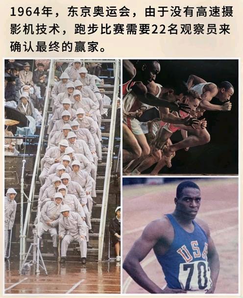 1964年,东京奥运会,由于没有高速摄影机技术,跑步比赛需要22名观察员来确认最终的赢家。科普一下