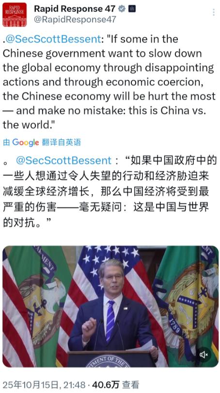 美国财长贝森特于10月15日晚表示:“如果中国政府中的一些人想通过令人失望的行动和经济胁迫来减缓全球经济增长,那么中国经济将受到最严重的伤害——毫无疑问:这是中国与世界的对抗。” 哪有把“贼喊捉贼”说得这么一本正经的?先不说别的,就说“经济胁迫”这四个字,要是真拿全球贸易史当镜子照,最先脸红的恐怕得是美国自己。 这些年美国为了保自己的产业优势,今天给中国商品加关税,明天对中国科技企业搞禁令,芯片、新能源这些领域说卡脖子就卡脖子,连盟友的企业都得跟着受牵连,这要是算“正常行动”,那中国坚持互利共赢、跟一百多个国家做稳定生意,反倒成了“令人失望”? 再说说“减缓全球经济增长”,这话更像是没看最新的全球经济报告。疫情之后这几年,国际货币基金组织好几次提到,中国对全球经济增长的贡献率常年保持在30%左右,有时候甚至更高,比美国和欧洲加起来都多。 反倒是美国自己,前两年搞大规模货币放水,把通胀压力传到全世界,后来又频繁加息,让不少发展中国家扛不住债务压力,这时候不说自己的问题,反倒来指责中国,未免也太会甩锅了。 还有“中国与世界的对抗”这种说法,简直是把“合作”和“对抗”的定义给弄反了。中国这些年一直在推动多边贸易,RCEP生效后,区域内的贸易成本降了不少,很多国家的农民、企业家都实实在在拿到了好处;“一带一路”倡议这么多年,建了不少铁路、港口、电站,帮一些欠发达国家打通了发展的瓶颈,这些难道是“对抗”? 反观美国,这些年动不动就搞“小圈子”,什么“印太经济框架”,本质上就是想把一部分国家绑在自己的战车上,排斥中国,这才是真的在破坏全球经济的整体性。更别说美国还动不动就“退群”,气候协定、联合国教科文组织说退就退,现在倒好,反过来指责中国“对抗世界”,这脸皮厚度,也是没谁了。 至于“中国经济将受到最严重的伤害”,这话更是没摸准中国经济的韧性。中国有14亿人的大市场,内需潜力摆在那儿,这些年又在搞产业升级,新能源汽车、光伏、高铁这些产业都在全球站稳了脚跟,就算外部环境有点波动,靠国内市场和产业升级也能扛住。 更别说中国跟全球各国的贸易联系早就不是说断就能断的。美国的农场主需要中国市场卖大豆,美国的汽车企业需要中国市场卖车,就连美国的高科技企业,比如苹果、特斯拉,在中国市场的营收都占了不小的比例。 要是真搞“对抗”,美国企业的损失恐怕一点都不少,贝森特这话,估计没跟美国那些靠中国市场吃饭的企业商量过。 说到底,贝森特这番话,与其说是在“警告中国”,不如说是在为美国自己的经济困境找借口。美国现在通胀压力没完全消,债务问题又悬在头上,产业空心化的问题也没解决,不想着怎么自己想办法,反倒来给中国扣帽子,试图把国内的矛盾转移到中国身上。 可全球经济不是小孩子过家家,谁在做实事,谁在搞破坏,各国心里都有本账。中国从来没想着跟谁对抗,一直都是想跟大家一起把全球经济的蛋糕做大。 倒是美国要是继续抱着“零和博弈”的想法不放,最后恐怕只会把自己的路越走越窄—,毕竟现在的世界,早不是谁能单方面说了算的时代了。
