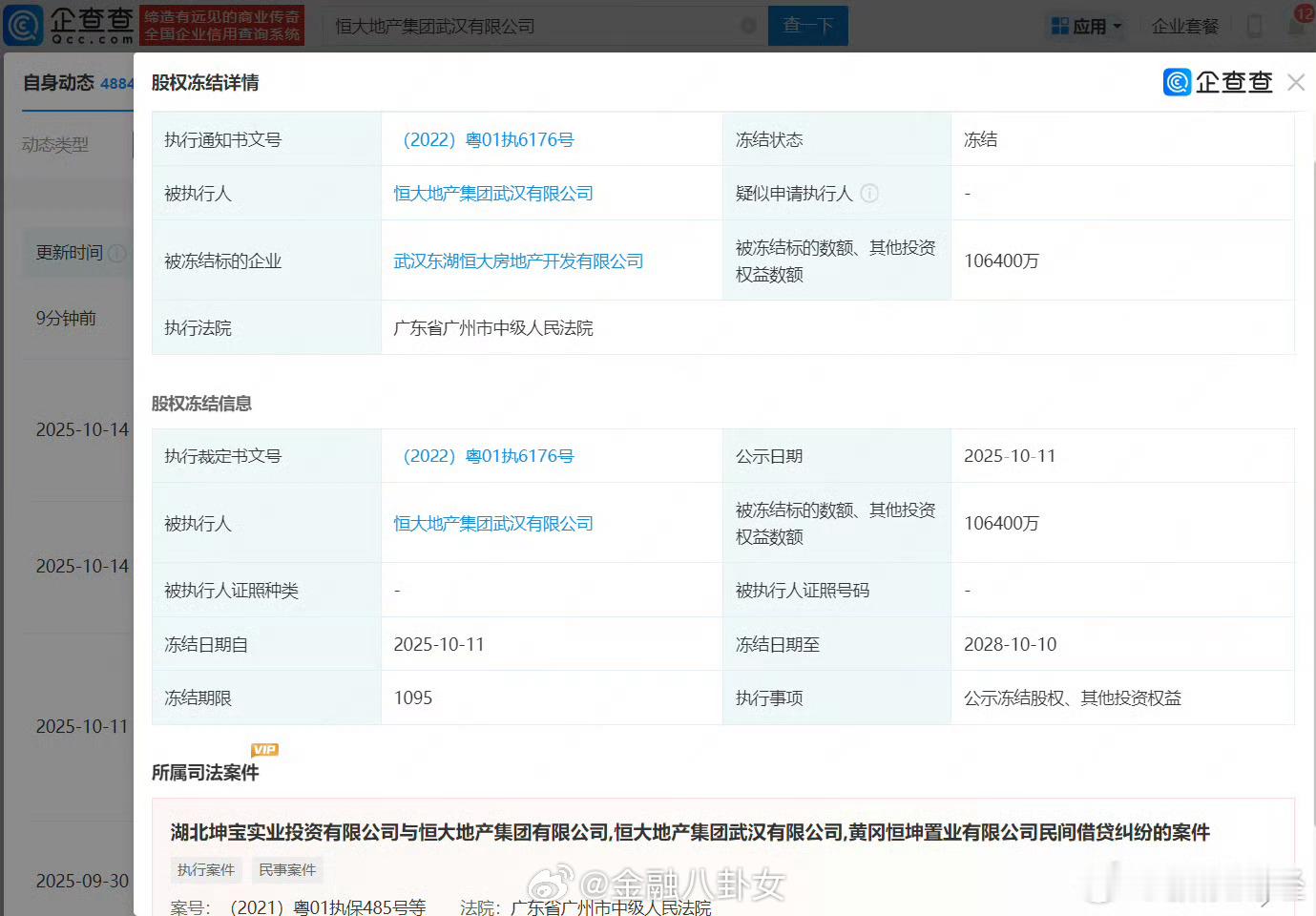 恒大地产旗下公司超10亿股权被冻结恒大地产集团武汉公司超10亿股权被冻结,冻结期限自2025年10月11日至2028年10月10日[思考]