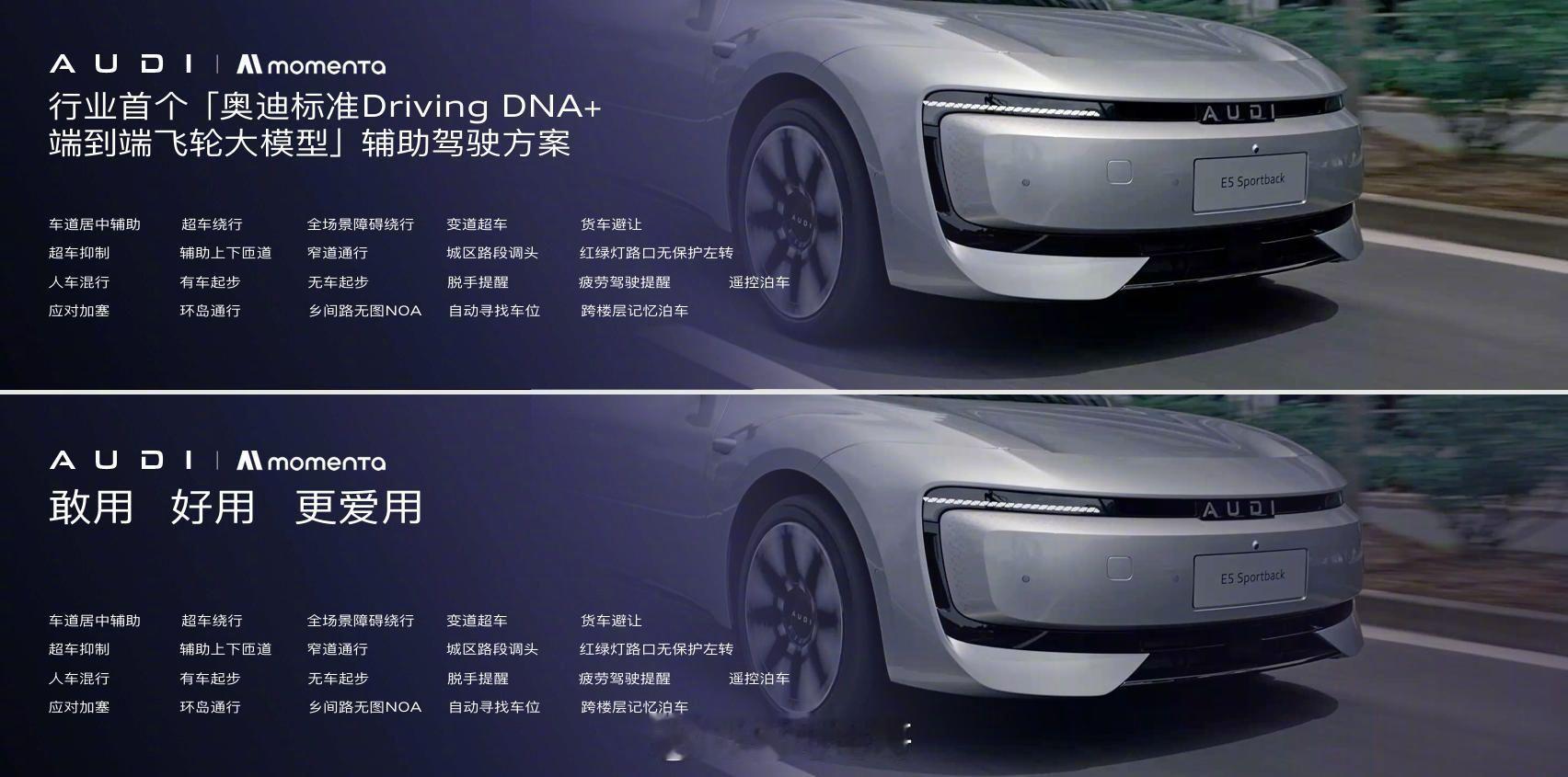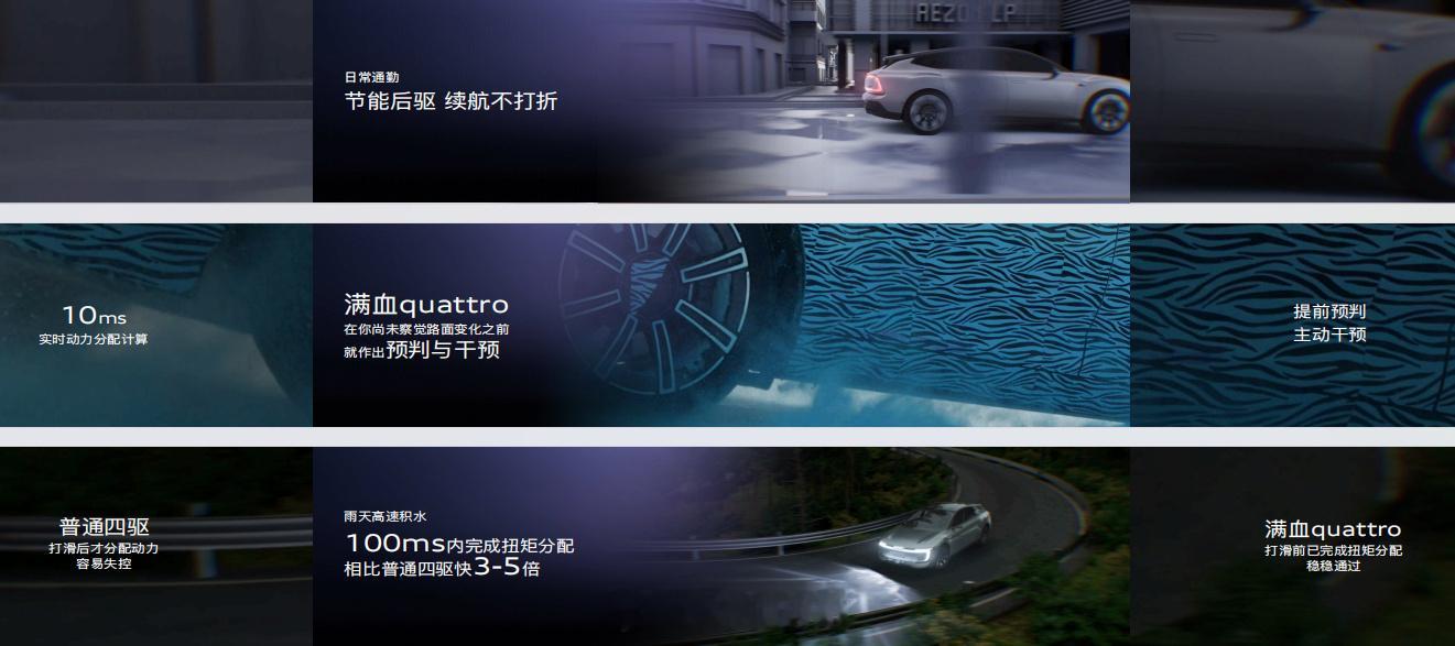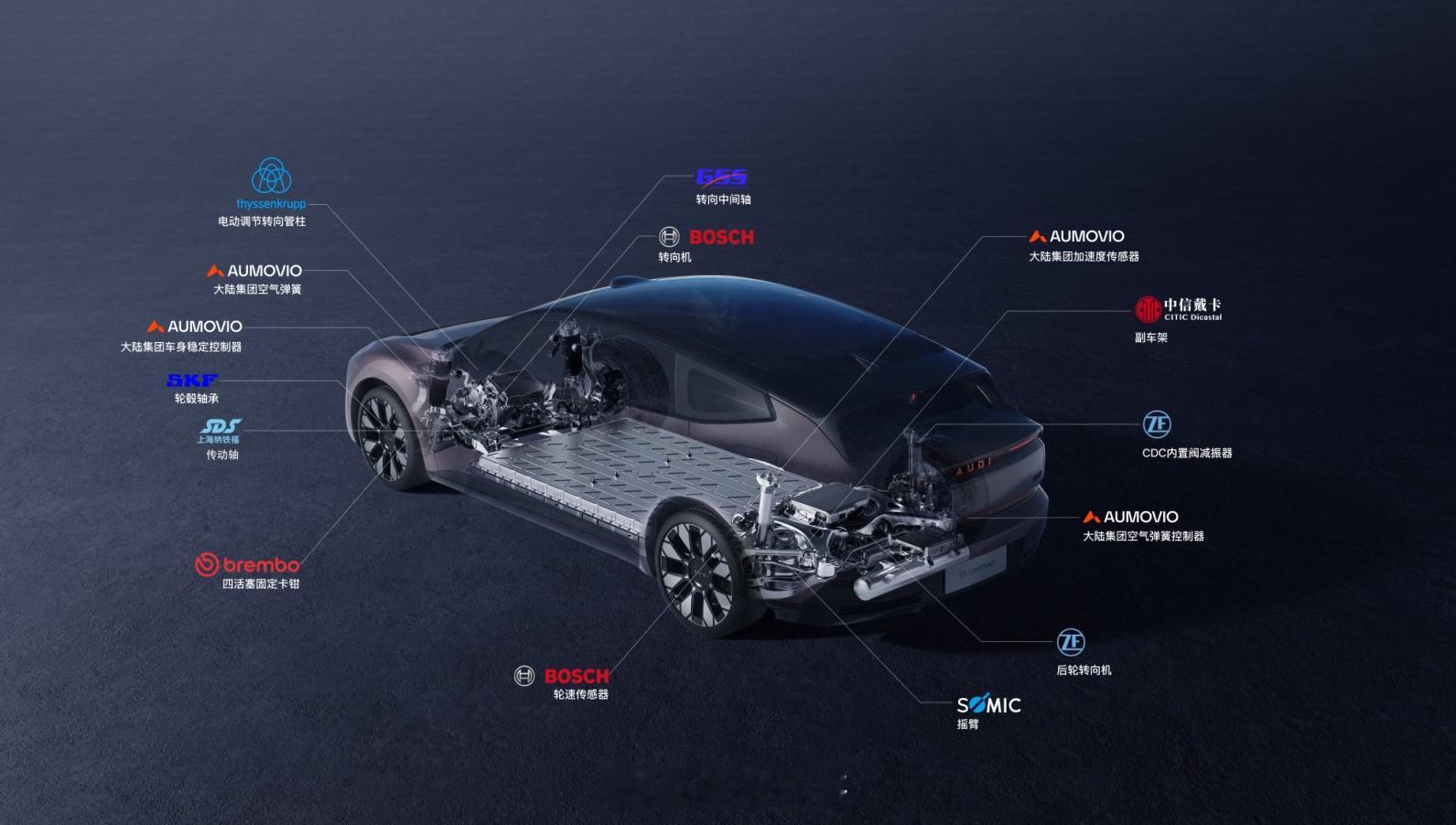 技术方面像激光雷达、Momenta的辅助驾驶、智能座舱、奥迪标志性的quattro、空悬+CDC、宁德时代三电。