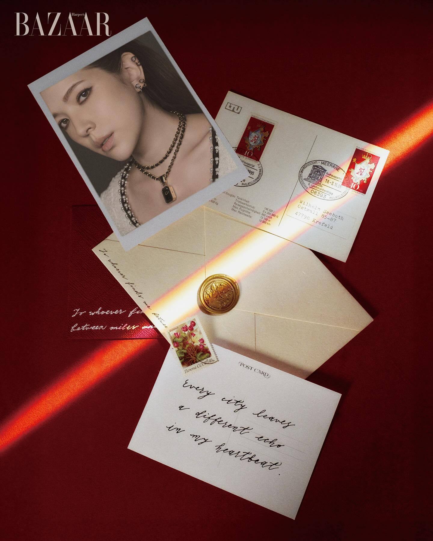 这张图里的人与物都在发光,和谐且美妙。一抹暗红唇色的汤唯明艳照人,De Beer