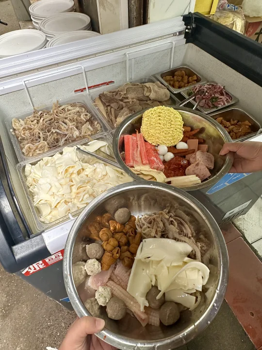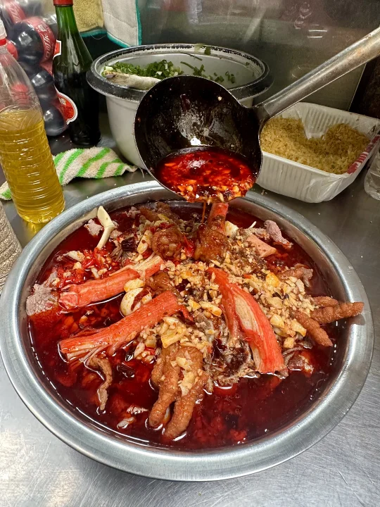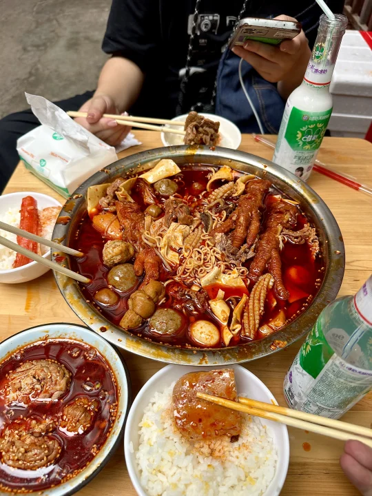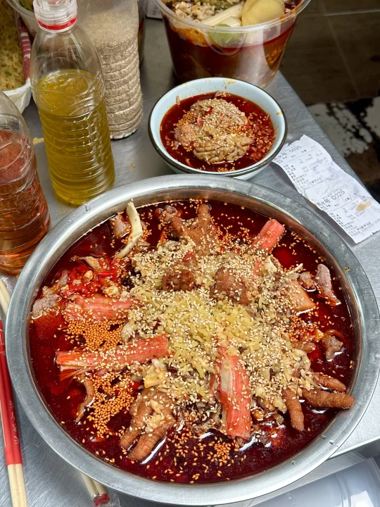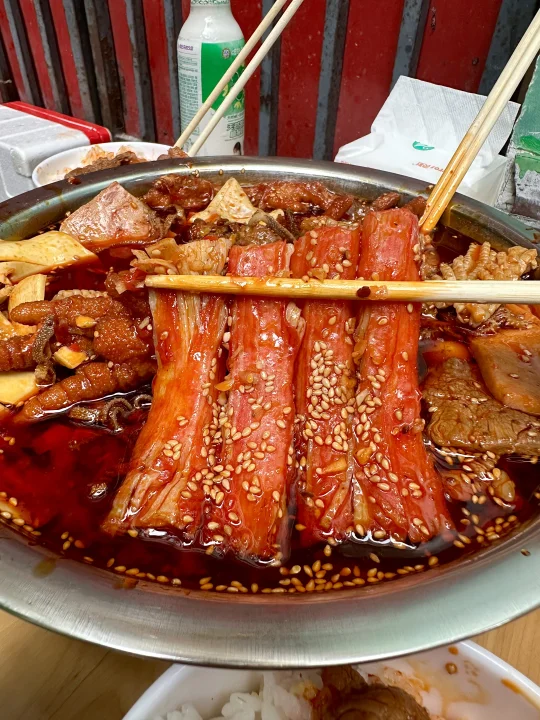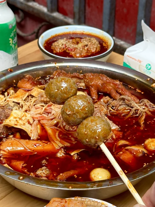 它家是自己选菜然后称重,分了素菜、普通荤菜、鲜货三个区域!重点是鲜货部分,毛肚、黄喉、牛肉这三样我每次都会拿!味道还是小时候吃的那种没有变,香辣入味,吃下来人均30-40的样子,真心安利给所有在成都的人!!!