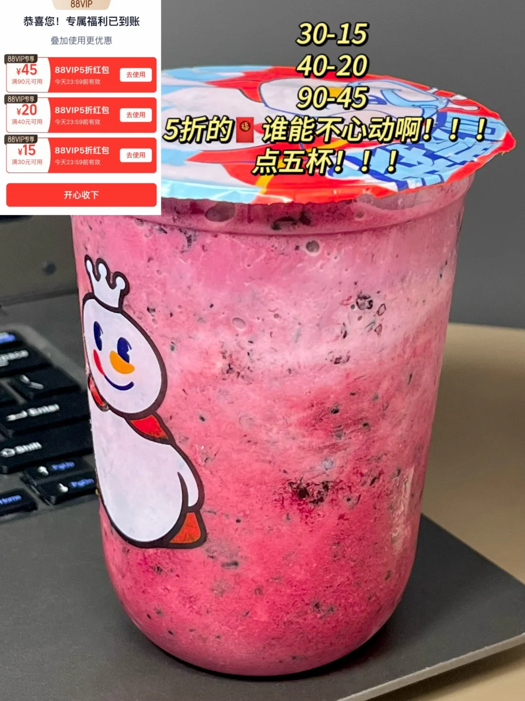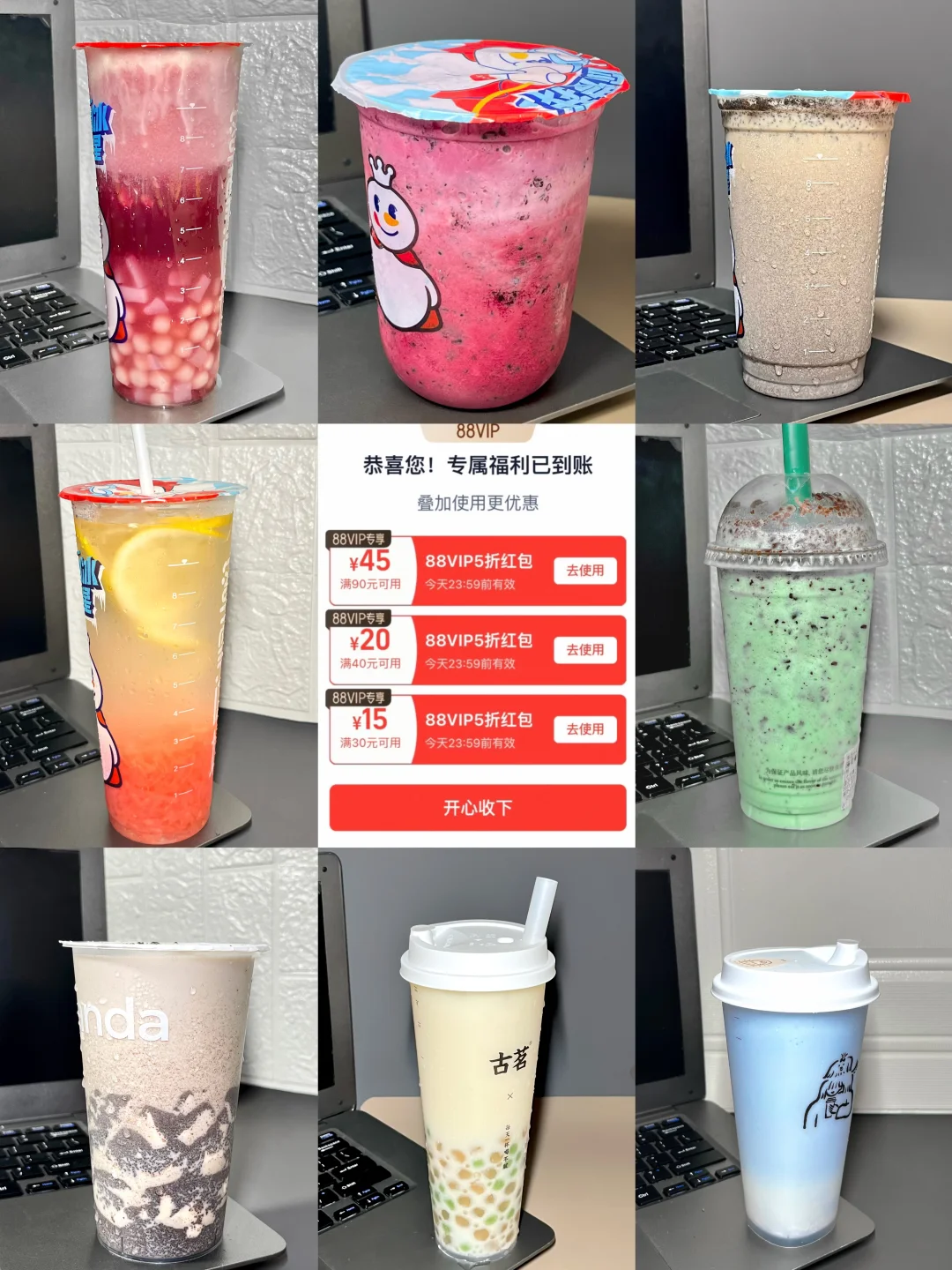 桑葚摇摇奶昔➕冰激凌➕椰果 芝士奶盖四季春 ➕奥利奥✖️2➕五分糖➕少冰 柠檬水➕正常冰➕五分糖➕红柚粒 葡萄芋圆➕奥利奥➕冰淇淋➕椰果➕正常冰薄荷椰皇酸奶奶昔➕薄荷味加满➕椰肉换黑巧脆➕三分糖 铁观音奶冻➕奥利奥➕正常冰➕三分糖 曲香茉莉➕三分糖➕正常冰➕奶盖➕珍珠 冰蓝生打椰➕芝士奶盖➕少少糖➕冰沙 香风芭乐茉莉➕三分糖➕正常冰 - 都是我经常点的好喝的奶茶果茶~现在闪购还有5折诶!!五折喝奶茶谁能拒绝啊!!!