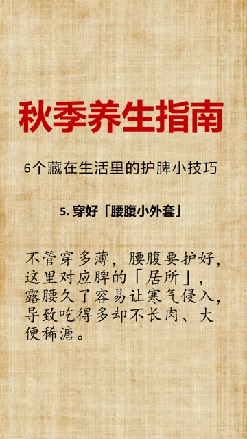 🍃5. 穿好「腰腹小外套」:不管穿多薄,腰腹要护好,这里对应脾的「居所」,露腰久了容易让寒气侵入,导致吃得多却不长肉、大便稀溏。
