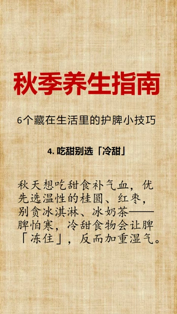 💐4. 吃甜别选「冷甜」:秋天想吃甜食补气血,优先选温性的桂圆、红枣,别贪冰淇淋、冰奶茶——脾怕寒,冷甜食物会让脾「冻住」,反而加重湿气。