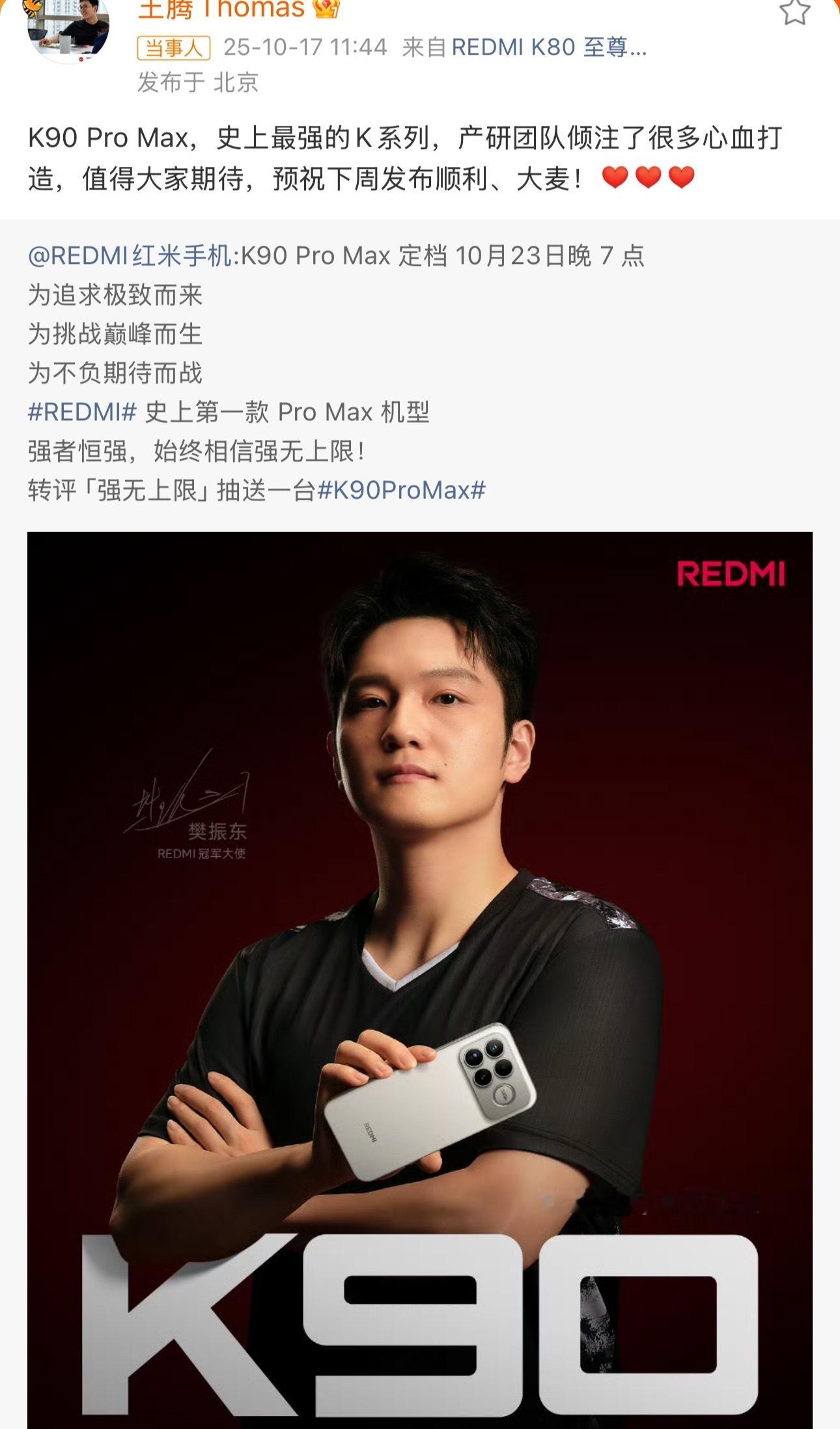 王腾宣传K90ProMaxK90系列有王腾的参与和心血,王腾在评论区表示正在准备创业项目,不知会做什么。