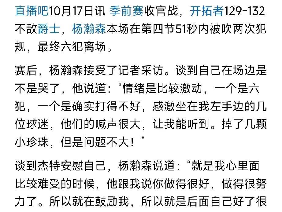 杨瀚森被打哭了?赛后接受采访表示情绪太低落! 开拓者最后一场季前赛,对手为爵士,爵士两个内线都非常强,一个人努尔基奇,另一个是能突能投的凯斯勒。 杨瀚森只有一记三分进账,上场15分钟0篮板6犯,这是他这场球必须要总结的问题。 6犯离场后,杨瀚森被媒体拍到似乎流泪了!赛后杨瀚森接受采访表示,自己打的的不好,情绪有些低落。但是,能看到旁边的杰特,应该是教练组成员一直在安慰杨瀚森,也让杨瀚森好了很多! 打的不好就是不好,总结自己的问题,常规赛见!