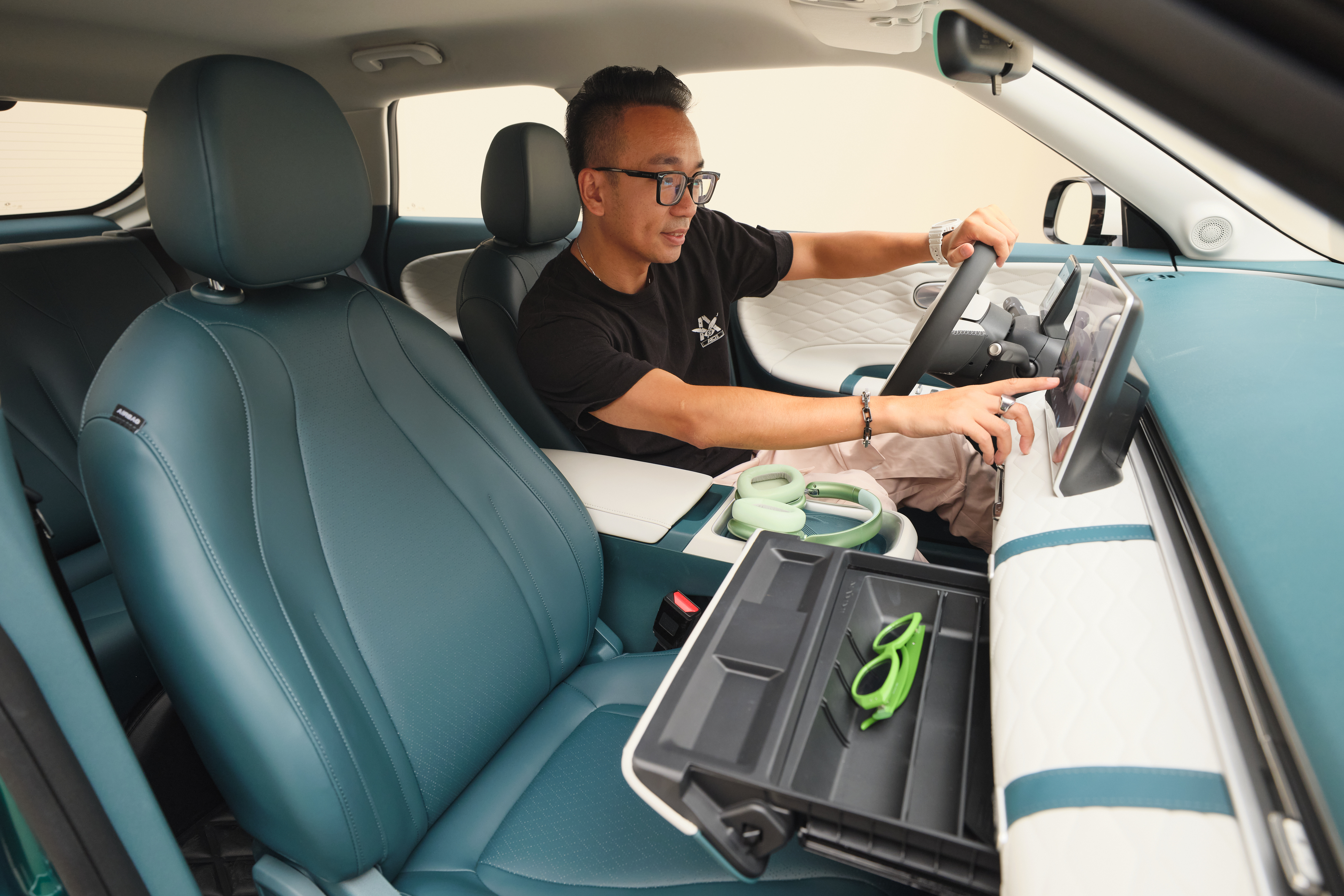 1、颜值党狂喜:全新「精灵绿」变色龙车漆+悬浮车顶,另外无框车门,副驾专属抽屉化妆台,主驾补光镜。