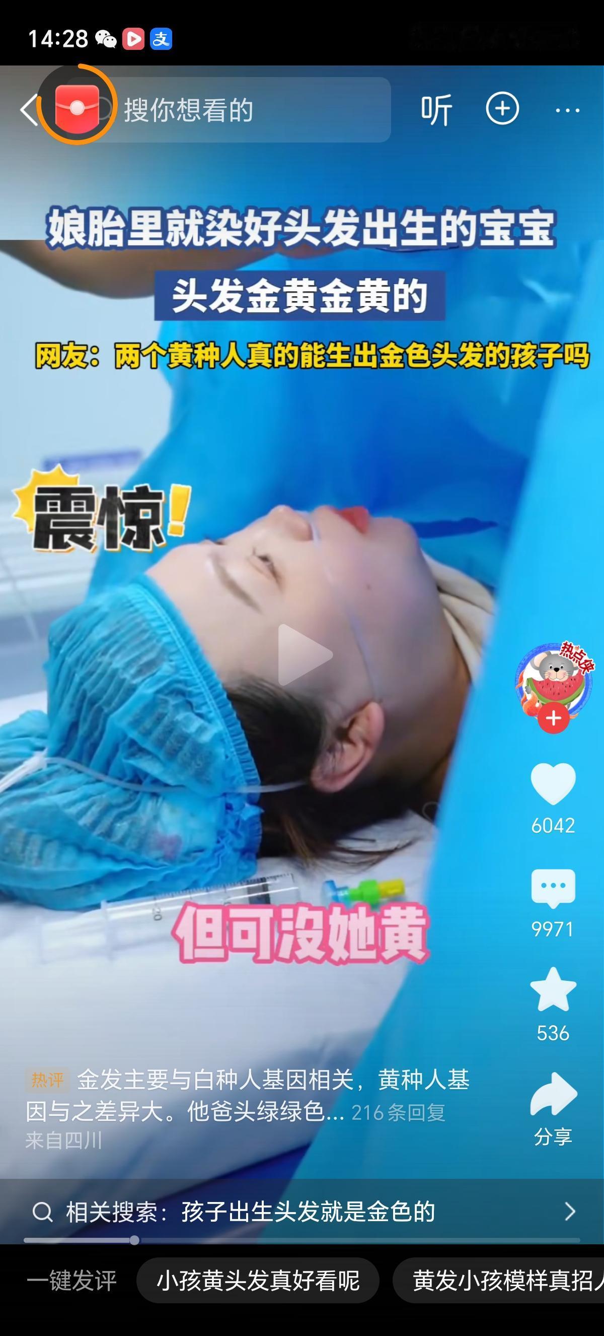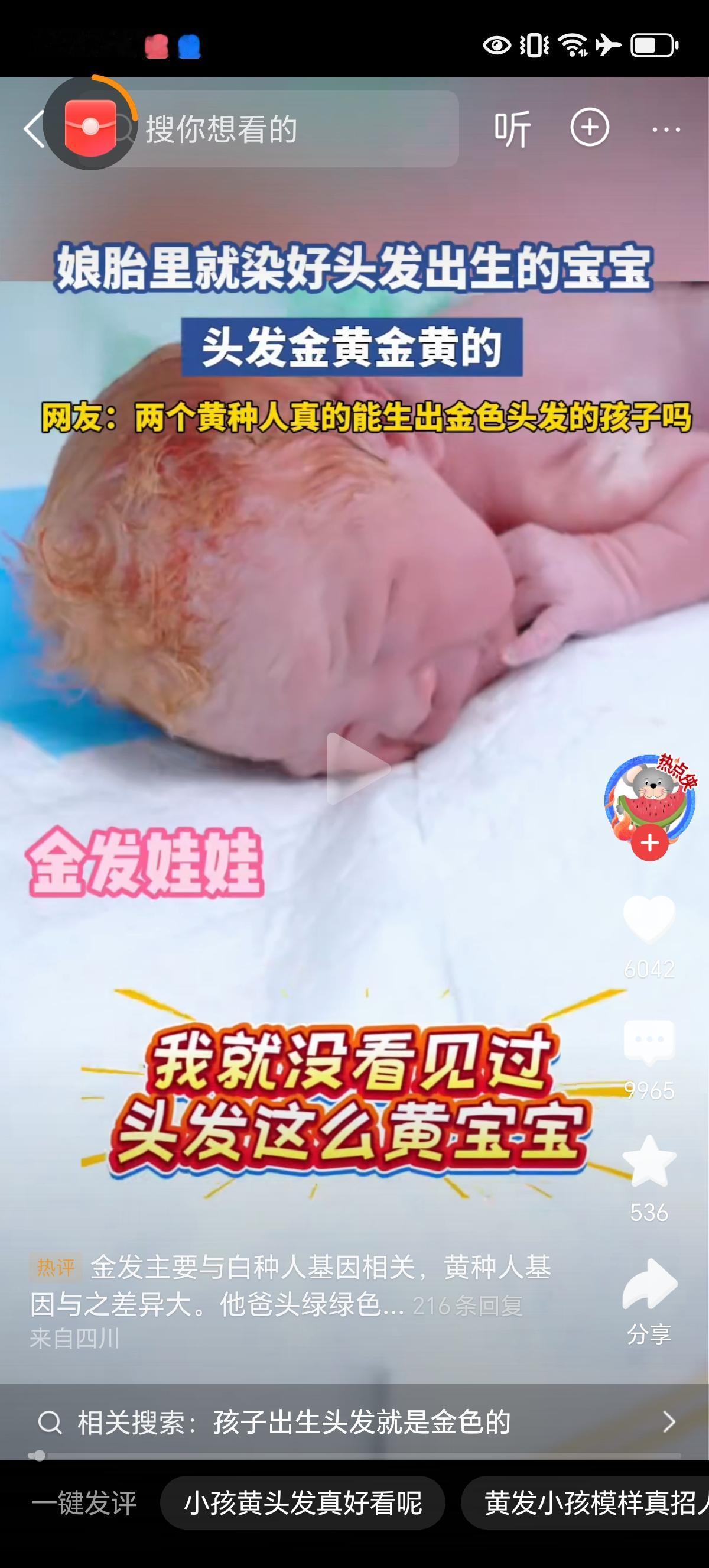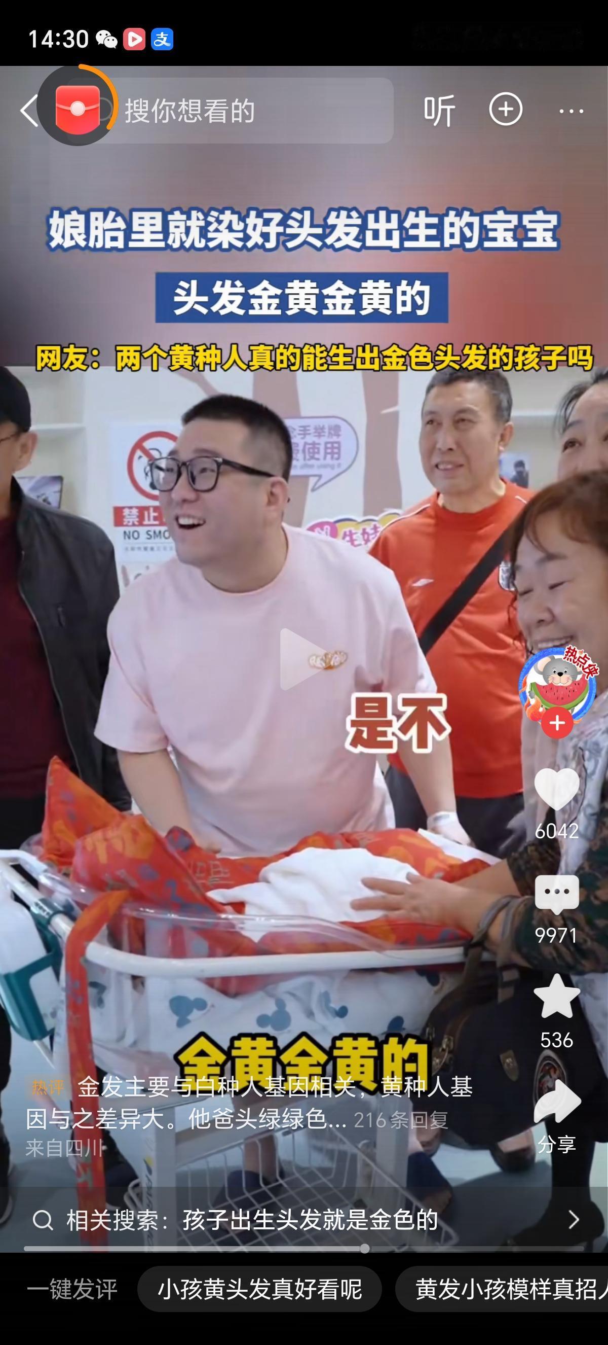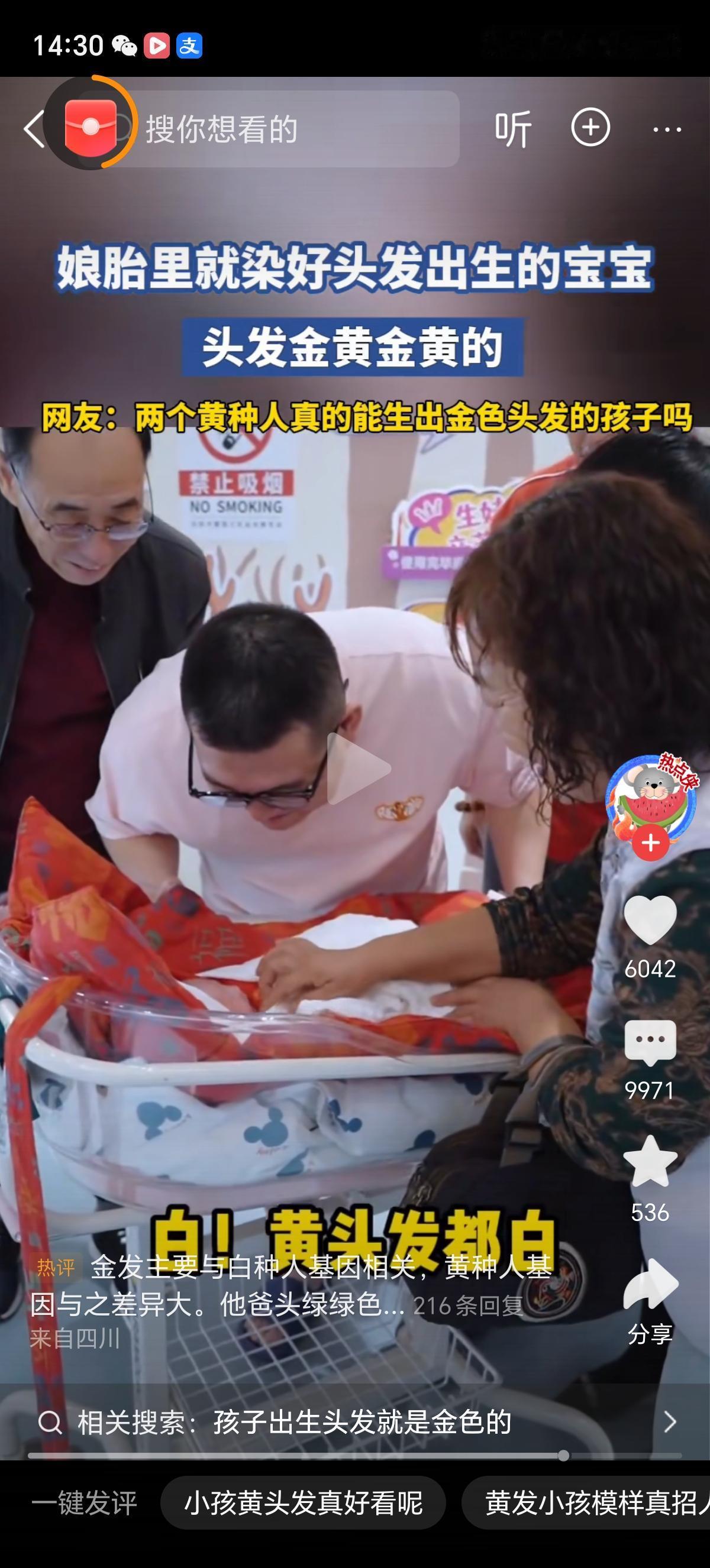 两个黑头发的父母真的能生出头发金黄金黄的孩子吗?这不是一般的黄啊,这是金黄色啊。 就是隔代遗传也不像啊,身边是孩子的爷爷奶奶和姥姥姥爷吧,没有一个头发是金黄色的,除了一个不知道是孩子奶奶还是姥姥的人明显做的偏红色的头发,其他人都是黑头发。 周围的即使有天生黄发的,也是遗传了孩子妈妈或者爸爸,或者隔代遗传,而且头发也没有这么黄,人家是栗棕色的头发。 这可真是太神奇了,难道孩子爸爸或者妈妈祖上有国外血统吗?这是头发返祖了?