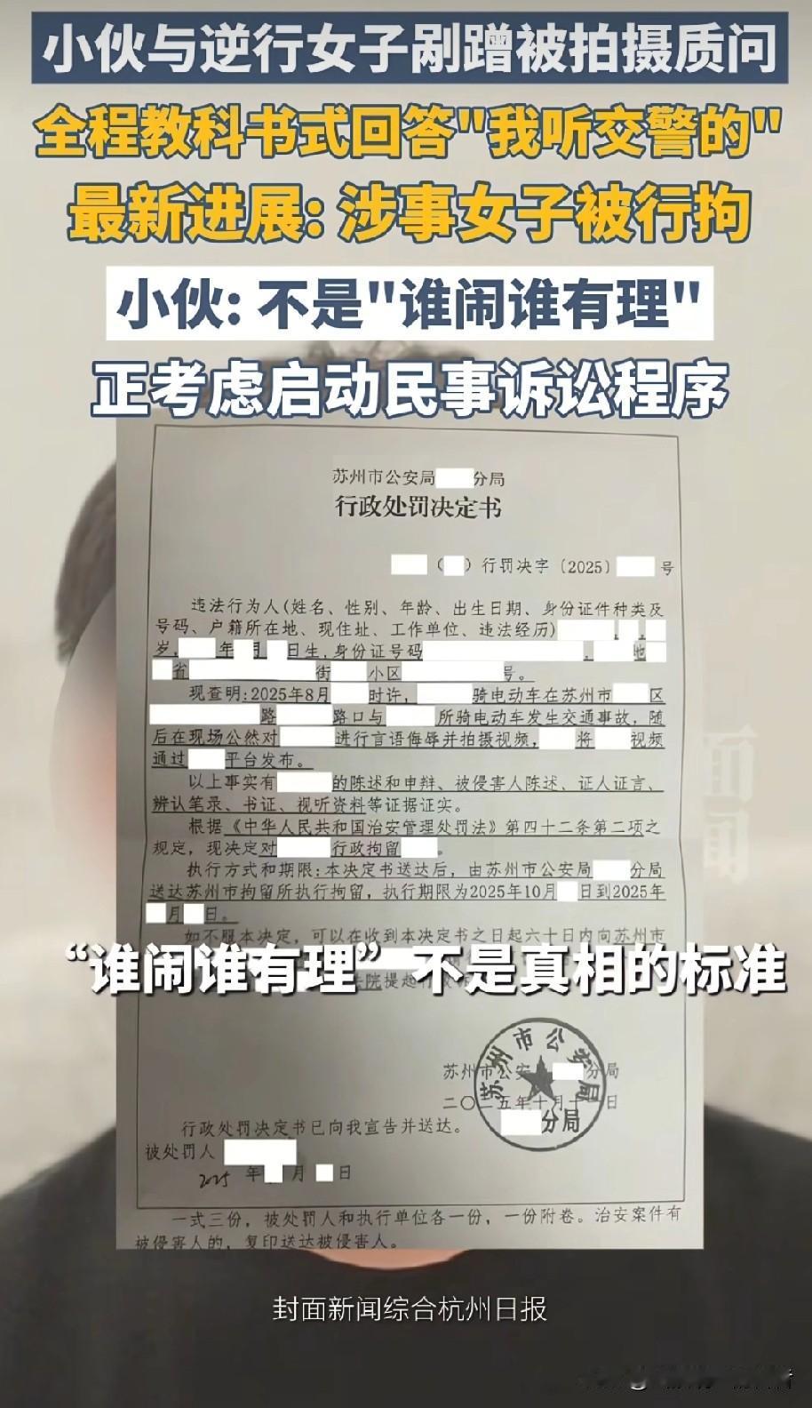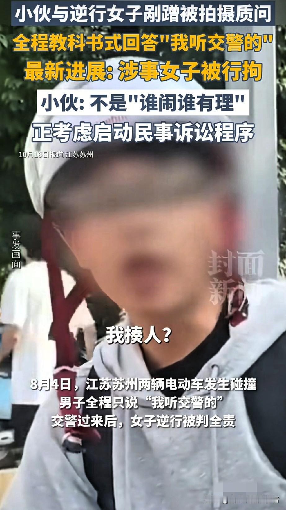 “我听交警的!” 苏州小伙一句话,让全网为他点赞。 结局舒适度拉满 你们还记得苏州那个“逆行姐”吗?后续来了!大快人心啊! 事情是这样的: 8月4日,苏州街头两电动车相撞。逆行女子不认错,还举手机怼脸拍小伙:“你凭什么不让我?” 你猜小伙咋回? 不吵不闹,就一句:“我听交警的。” 重复N遍,情绪稳如泰山! 结果呢? 交警来了判她全责,她居然半路逃跑,还把视频发上网网暴小伙! 现在后续太舒适了: 女子已被行政拘留 小伙正考虑民事索赔 网友狂赞:教科书式应对! 这波反转告诉我们: 别以为谁拍视频谁有理 遇事别上头,找警察最管用 冷静理智的人,才是真赢家