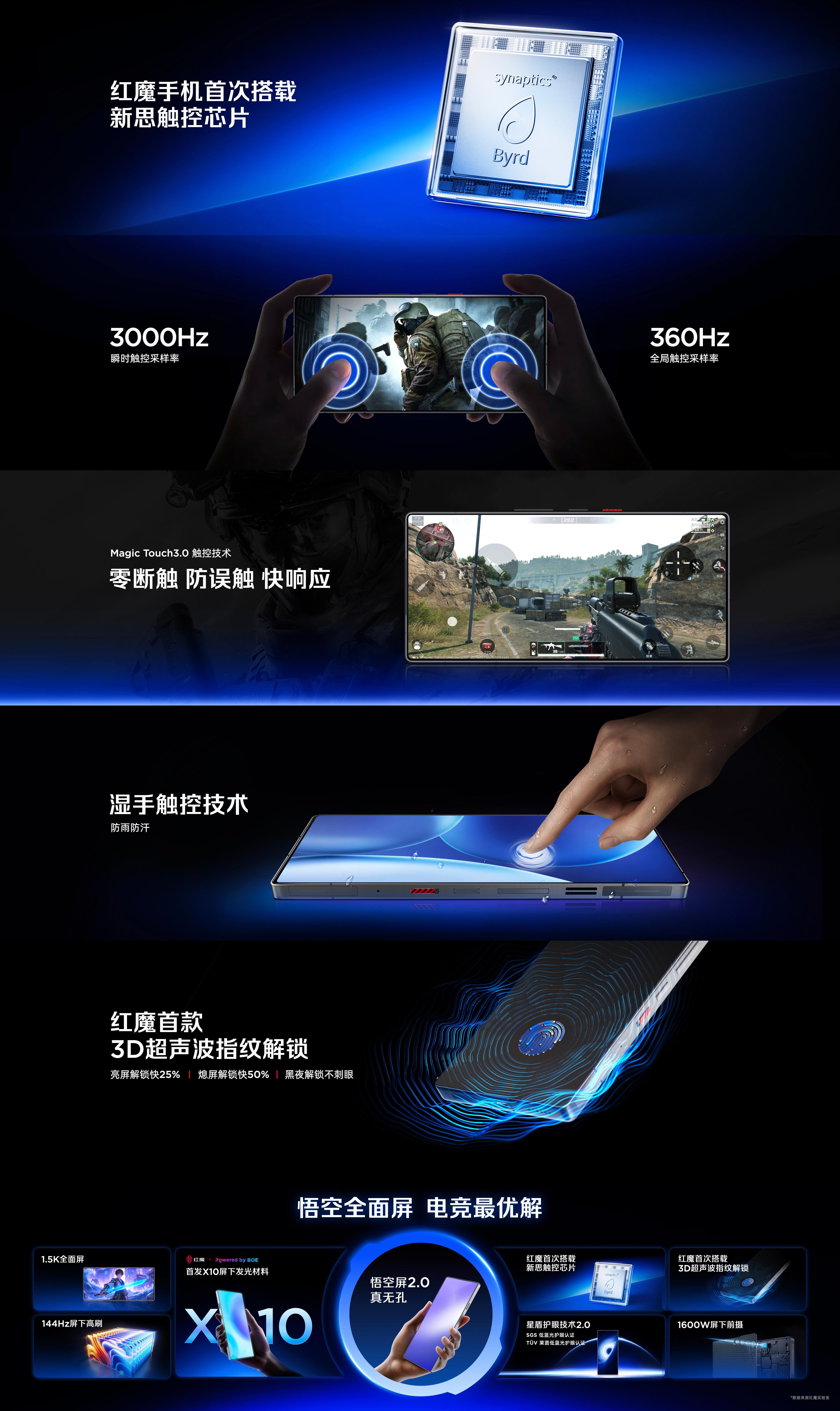1600W屏下前置摄像头,首发X10屏下发光材料,1.5K+144Hz+星盾护眼技术2.0,首搭载新思触控芯片,Magic Touch 3.0触控技术,支持湿手触控,首搭3D超声波指纹解锁。
