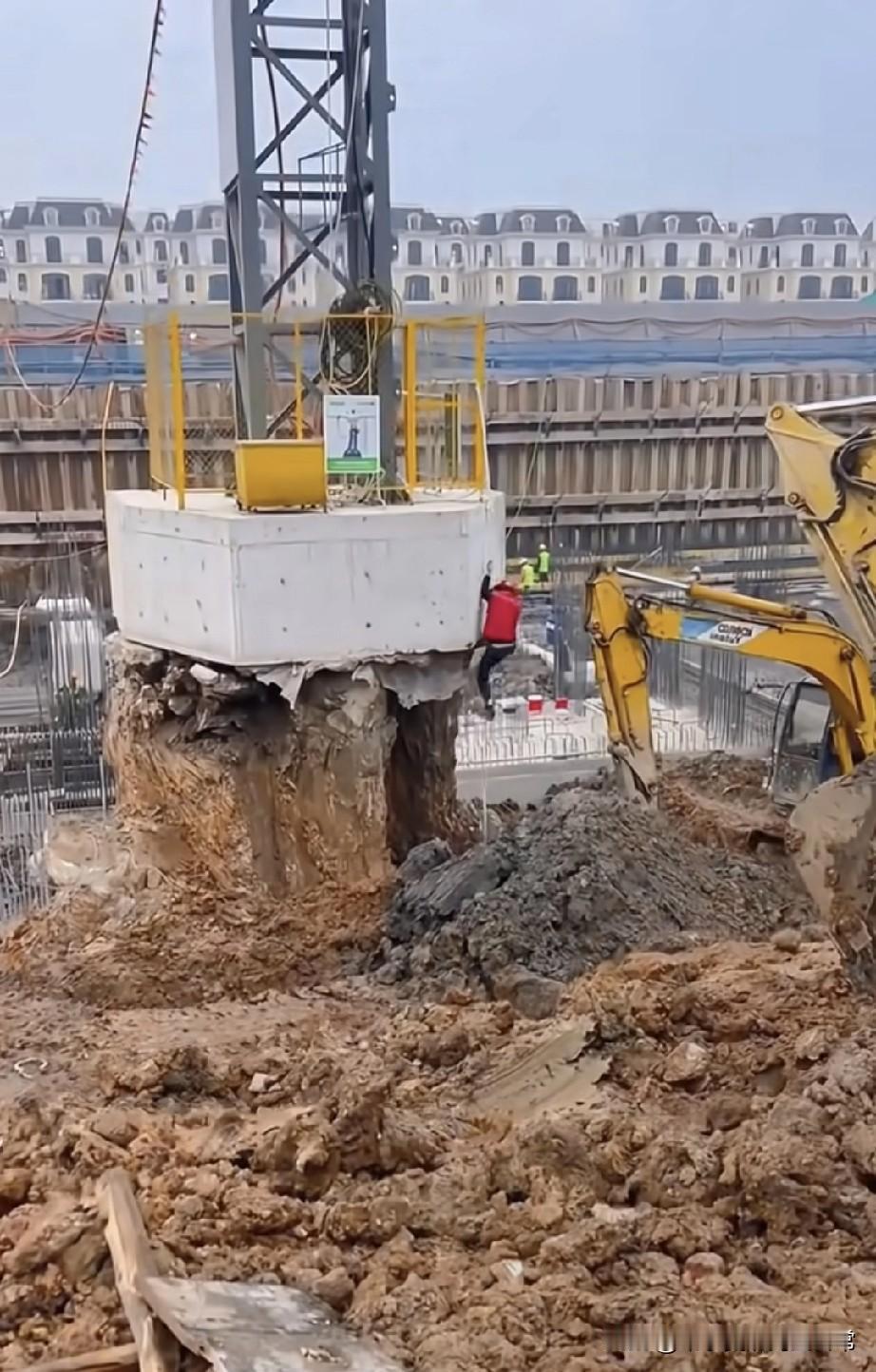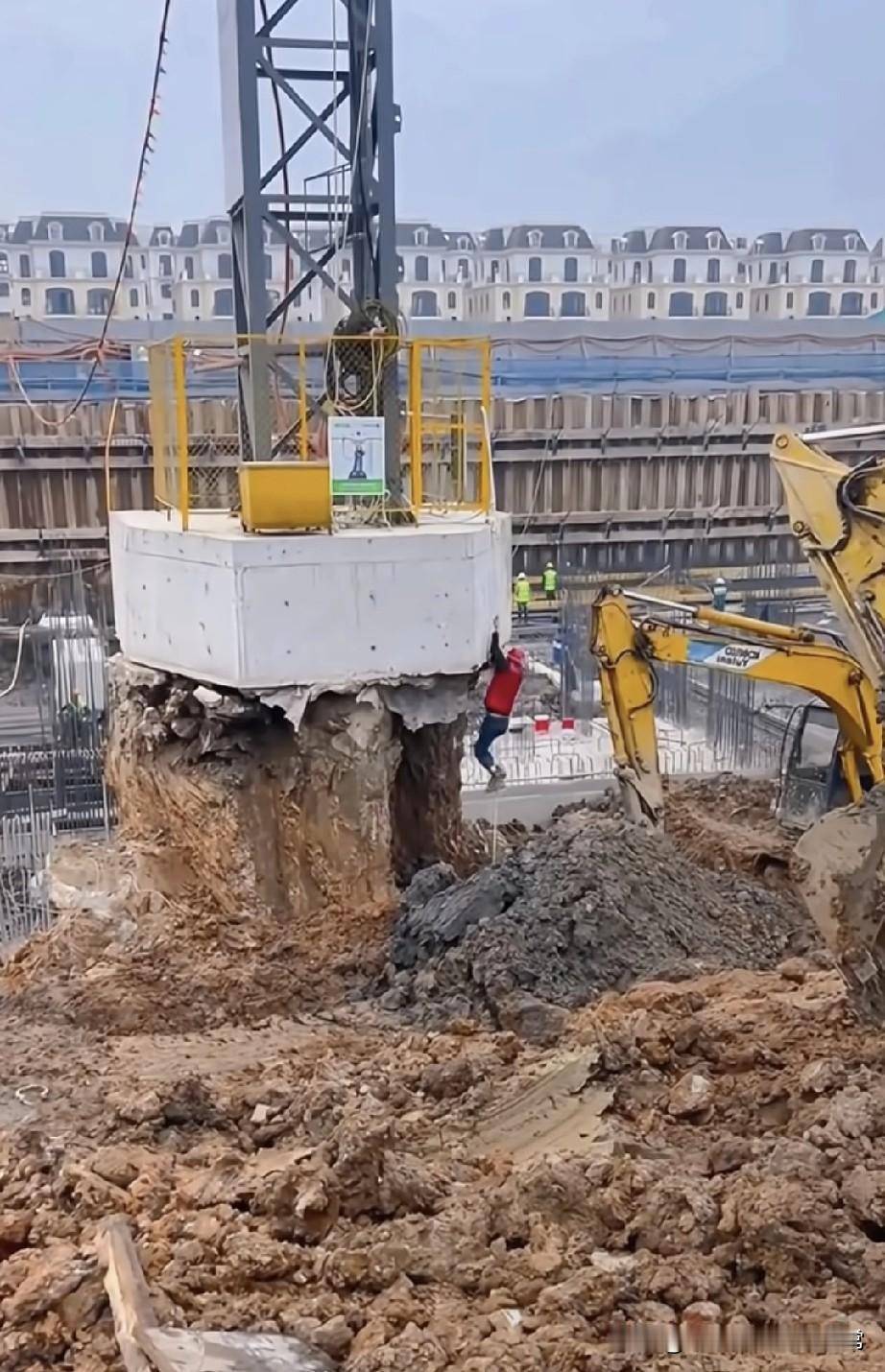 悬空塔吊!这波操作要罚多少? 这工地骚操作!塔吊底座都快被土吃了还敢开工,这