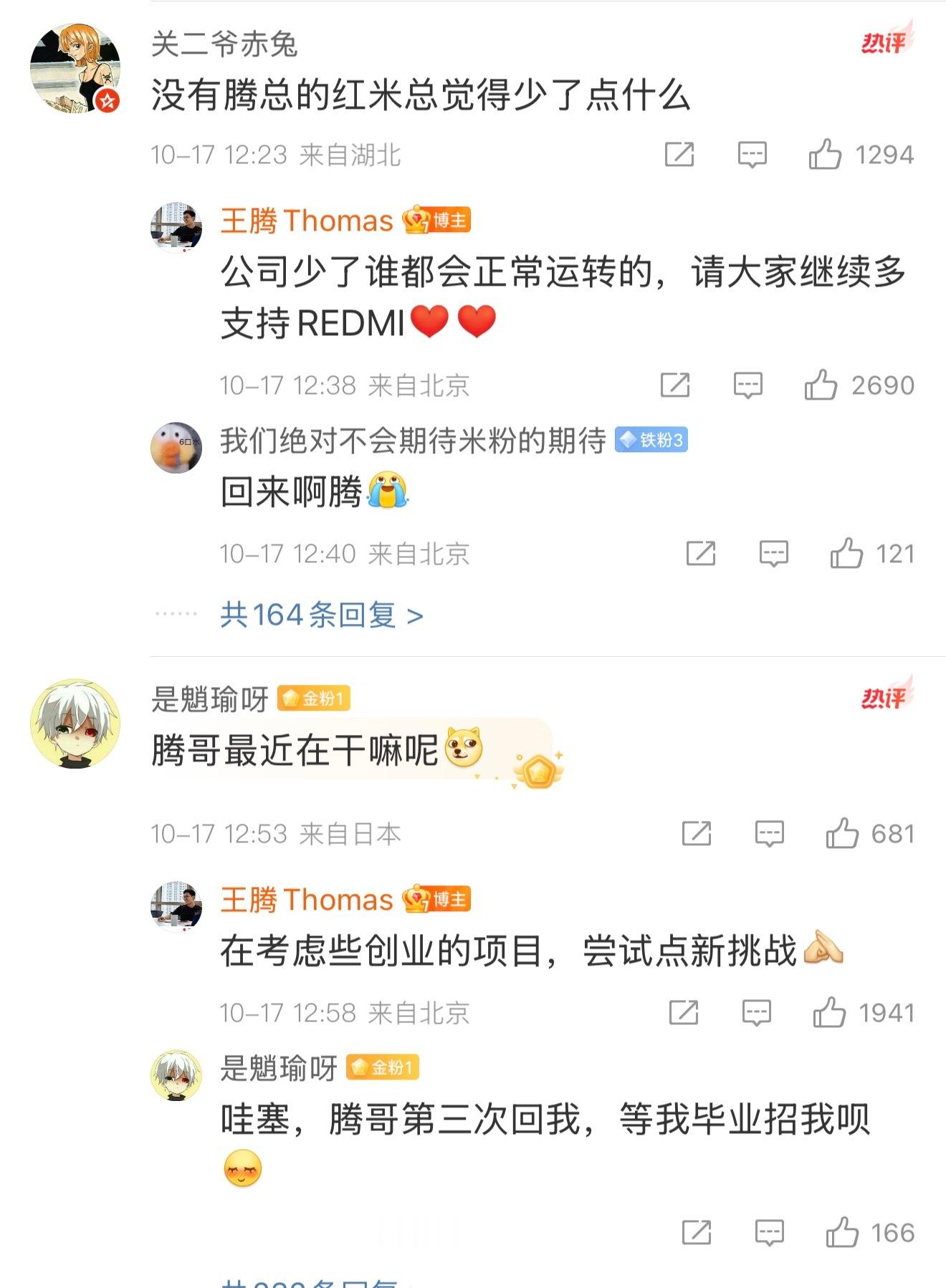 有网友问王腾接下来干什么,他表示考虑一些创业项目,我估计还是会从事手机行业,只能自己创业了,回红米不可能,去其他竞品也不太现实。