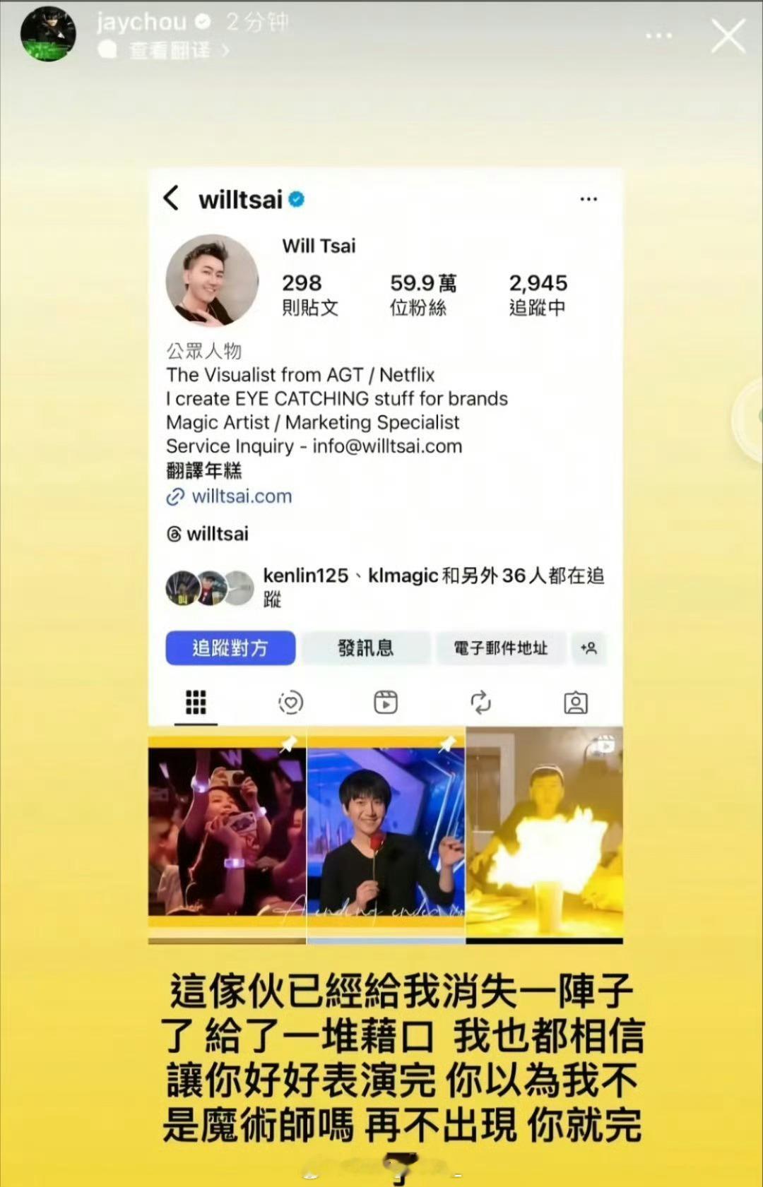 周杰伦警告蔡威泽再不出现就完了周杰伦发文警告曾经的好友蔡威泽:再不出现你就完了。