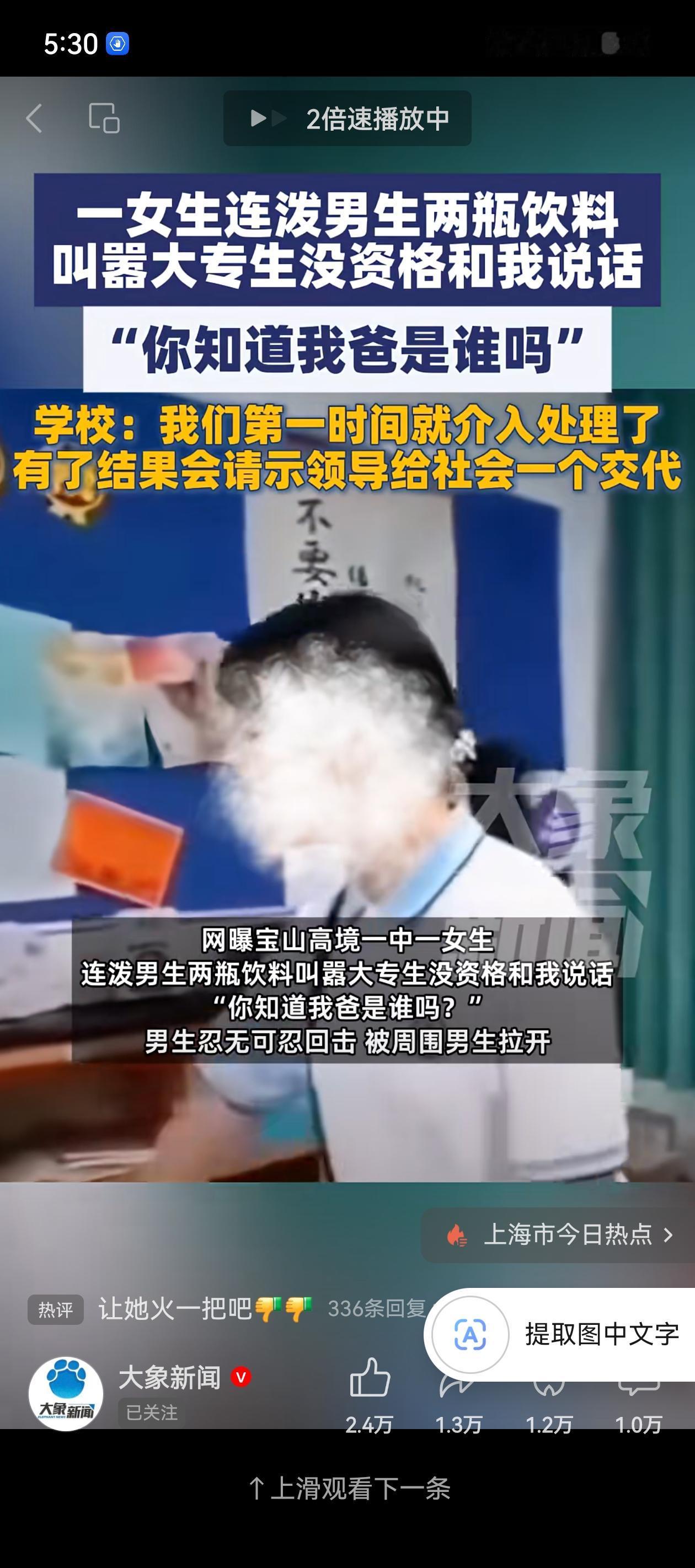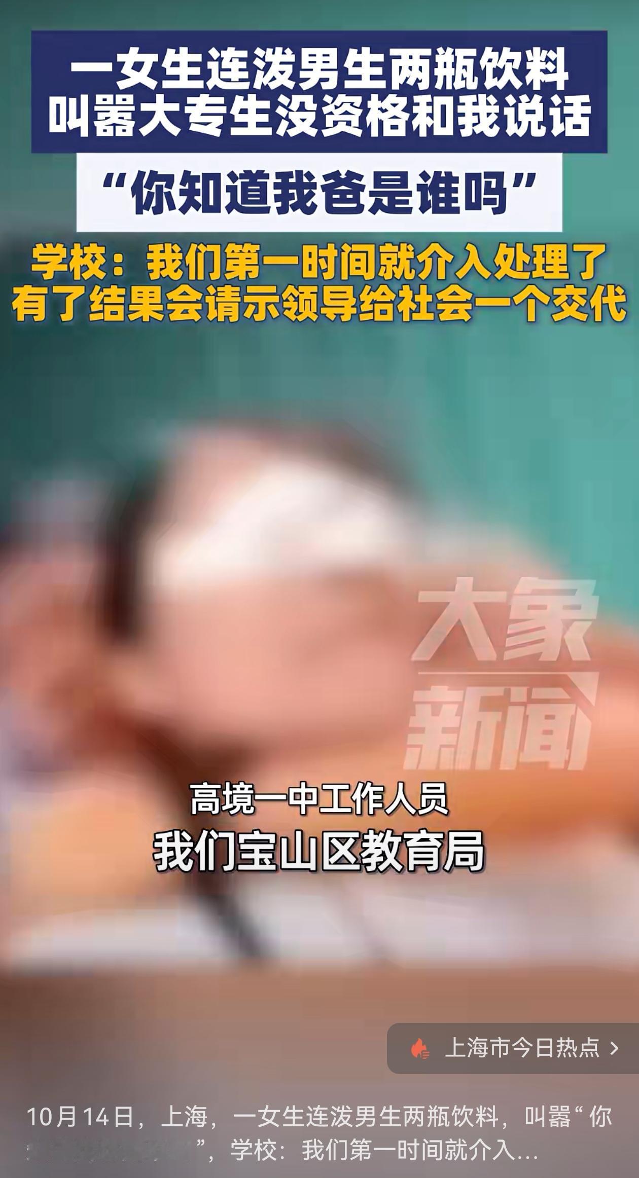 “爸爸”是谁?2025年10月14日,上海宝山区一高中女生和一个男生发生冲突。 女生很彪悍,不仅口头上占上风,还接连开了两瓶饮料,一直向那个男生的头上和身体上泼饮料。 视频很清晰:“我告诉你,像你这种高中、大专生有资格和我说话吗?你知道我爸爸是干什么的?” “我一点都不好惹”! 这女生一句“你知道我爸是干什么的”,可把大家的好奇心全勾起来了! 目前,高中女生的爸爸的具体身份和职业还没有任何官方信息。 女孩父亲的身份依然是个谜,这种悬念确实让人心痒啊!虽然无论家庭背景如何,都不是在校园里轻视甚至伤害他人的理由。 太想知道“爸爸”是谁啦! 信息来源:大象新闻