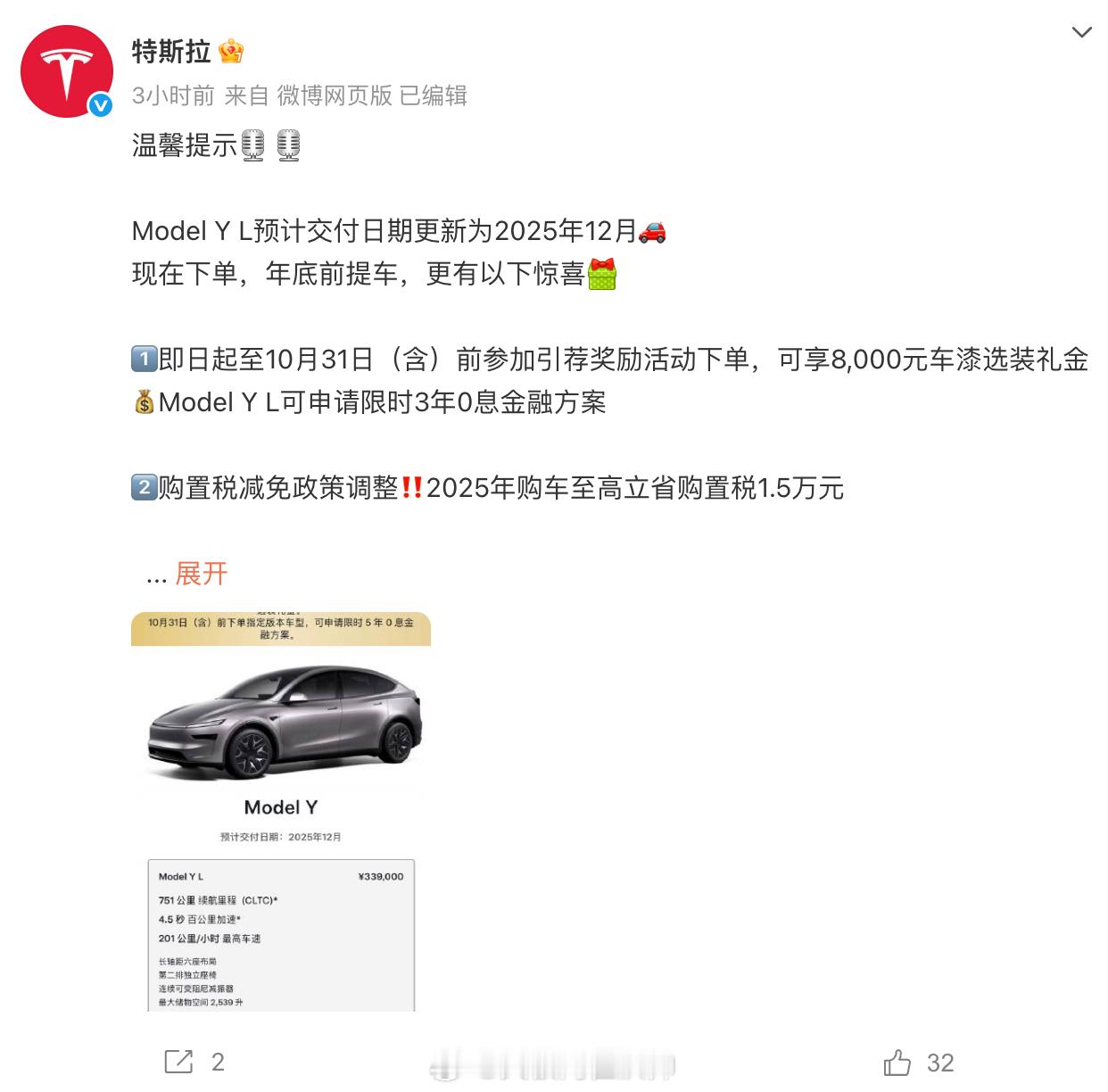 特斯拉今日宣布ModelYL预计交付日期更新为2025年12月,