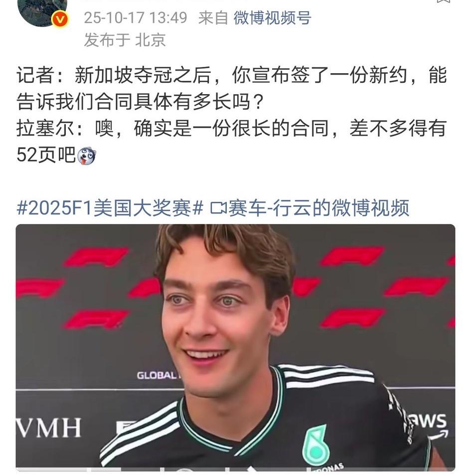 怪不得他的合同有52页长呢! 拉塞尔与梅奔续签了一份多年合同,年薪高达3000万英镑(约4000万美元),在F1中排名第三高,仅次于红牛的维斯塔潘和法拉利的汉密尔顿。