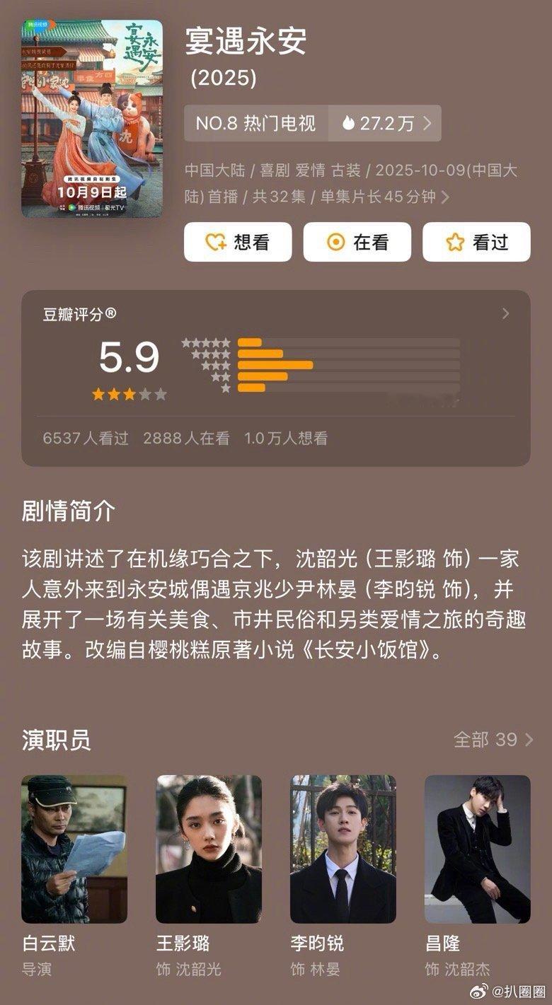 王影璐、李昀锐《宴遇永安》豆瓣评分5.9