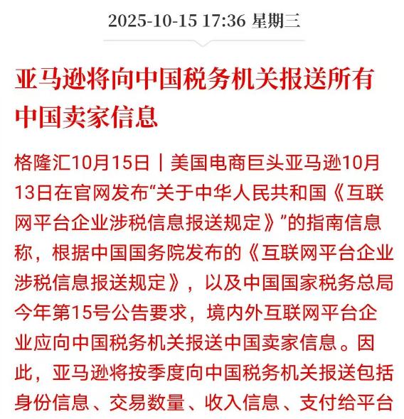 亚马逊突然向全球中国卖家发出通知,要求10月31日前向中国税务机关报送三季度完整交易数据,这不是亚马逊故意找茬,而是全球税务圈的“透明化大潮”终于拍到跨境生意的岸边了。 要说清楚这事儿的门道,得先看全球那盘大棋。G20早就牵头让经合组织搞了套“金融账户涉税信息自动交换标准”,说白了就是各国税务机关要互通有无,谁家的纳税人在海外藏收入、逃税款,一查就能对上线。 现在已经有100个国家承诺实施这套标准,中国2018年就跟着启动了首次信息交换,这根本不是针对中国卖家的特殊政策,而是国际社会早就达成的共识。亚马逊作为全球最大的跨境电商平台,不可能逆着这股潮流走,毕竟跟各国税务部门对着干,吃亏的只会是自己。 再看国内的规矩,亚马逊更没理由含糊。它在中国有正经的运营主体,不管是亚马逊卓越还是上海的贸易公司,都拿着合规资质,而国家早就出台了《非居民金融账户涉税信息尽职调查管理办法》,明确要求平台得配合税务部门收集报送信息。 更何况今年金税四期已经全面落地,税务、海关、银行的系统全打通了,资金流、货物流、信息流能一站式监控,别说亚马逊,就是其他跨境平台也得老老实实报送数据,想靠“没在中国设公司”躲清闲根本不现实。 对亚马逊来说,这波操作其实是“趋利避害”。要是敢不报、瞒报或者漏报,按照规定最高能罚50万,搞不好还得停业整顿,这损失可比配合报送大多了。 而且它报的数据也不是随便填填,得把卖家的纳税人识别号、 店铺ID这些“身份底册”交上去,还要附上三季度的销售总额、订单数量、净收入这些明细,一分一厘都不能含糊,毕竟税务部门拿着这些数据,能直接跟海关的报关信息比对,要是销售额和货值对不上,立马就能锁定异常。 最该琢磨明白的其实是卖家们,这事儿压根不是“针对谁”,而是跨境生意的合规门槛实实在在提高了。以前跨境电商刚兴起时,有些卖家靠私户收款、低报货值避税,因为平台和税务系统没打通,确实藏在了监管盲区里。 可现在金税四期的AI算法能自动比对行业税负率,个人账户年收款超200万没申报就得预警,亚马逊把交易数据一交,相当于给每个卖家的收入建了本“明账”,再想耍小聪明根本行不通。 说到底,这波报送通知就是个信号:跨境生意的“野蛮生长”时代过去了,合规才是长久生存的根本。亚马逊不过是先站出来接了招,毕竟跟着国际共识和国内规矩走,才能在全球市场稳当做生意。 对卖家来说,与其抱怨麻烦,不如赶紧把税号备齐、核对好收入数据,老老实实申报纳税,毕竟在税务透明化的大趋势下,合规这道坎,迟早都得跨过去,早适应早踏实。