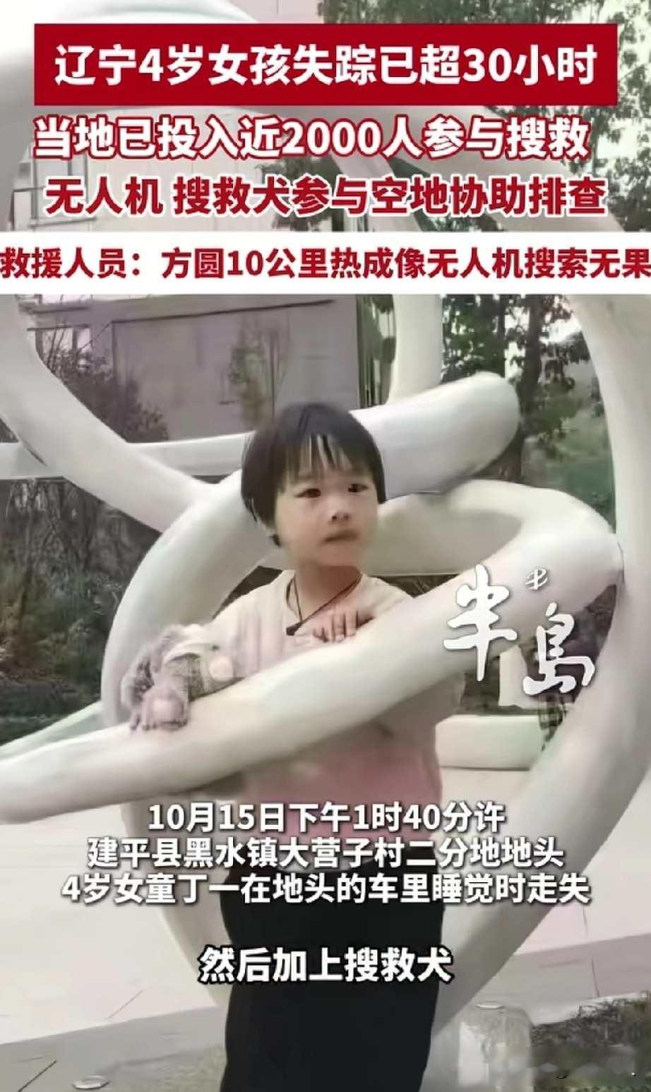 四岁女童山野失踪30小时,全网疯找却疑点重重,她到底经历了什么? 辽宁黑水镇有个四岁的小女孩,叫丁一,10月15号晚上,她在面包车里睡着了,人就不见了,家里人急得不行,立马报了警,村民、警察、志愿者全都出来找,无人机也飞上天转了一圈,直到17号凌晨,有人在山沟里找到了她,孩子没受什么大伤,送去医院观察了。 可这事没那么简单,网上有人讲,孩子走失前,有博主一边直播求救,一边卖货,是不是为了流量故意闹出来的,还有人猜,是不是有人趁乱把孩子送回来,想躲责任,毕竟重庆以前也出过类似的事,更让人纳闷的是,孩子明明在车里睡着,怎么就没个人看着,是老人带得太松,还是大人太忙了。 这事儿暴露了不少问题,农村孩子没人管是常态,城里节奏快,爸妈没空,老人也帮不上忙,这次找人靠人找加无人机,要是孩子戴个定位手环,早就能找到,抖音快手上的寻人视频刷屏,有人真帮忙,也有人演戏蹭流量,去年河南就有自媒体造假现场被封号。 公安部刚推出乡村儿童安全守护计划,辽宁也出台了新规定管留守儿童,可真出了事,还是得临时找人,专家说,以后再发生这种事,可能就得强制装定位器,或者让家长登记看护责任。 孩子醒了能说清楚当时发生了什么吗,心理医生得看看她是不是吓着了,真相不是网友点个赞就能定的,得等医院的报告、监控的录像,还有警方的调查结果,现在别忙着说奇迹,也别急着骂是骗局,先等等看事实到底怎么说。
