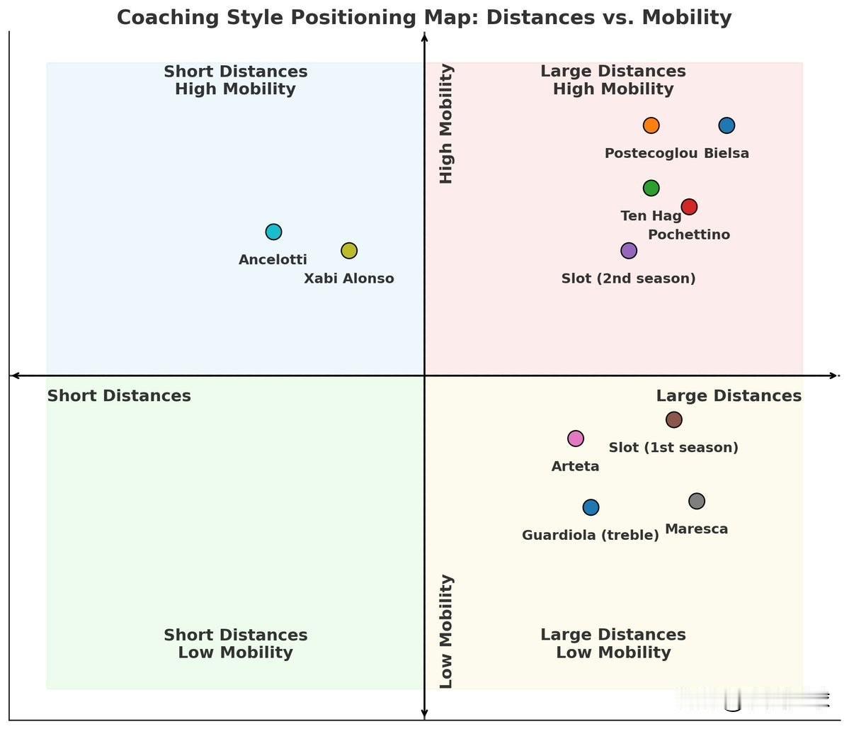 在足球战术中,教练必须权衡需要承担与规避的风险。 球队层面最核心的两大风险是距离风险与流动性风险:采用较大的球员间距本质上是冒险行为,高流动性打法同样如此。 顶级教练通常侧重某一风险而弱化另一风险,这更应被视为一个谱系而非非此即彼的选择。 例如阿隆索执教的勒沃库森与安切洛蒂的皇马,虽然保持高流动性,但通过压缩球员距离来抵消流动性带来的风险;相反,马雷斯卡与阿尔特塔则始终利用球场最大宽度,在控球时采取大间距布局,但显著降低球员流动性。 亦有教练试图同时挑战两种风险,但在顶级赛事中难以持续成功。贝尔萨、波斯特科格鲁、滕哈赫与波切蒂诺均属此类。这种做法通常引发三大问题:攻防转换时的防守漏洞、身体疲劳以及认知负荷过重。 对于斯洛特而言,适当降低流动性、回归其上赛季的战术思路将是更明智的选择。