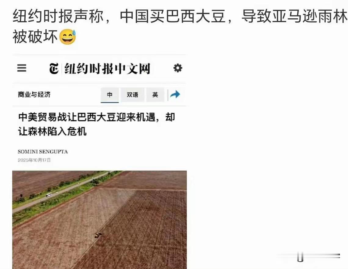 纽约时报说,中国不买美国的大豆,而是去买巴西的大豆,进而导致亚马逊雨林被破坏!?