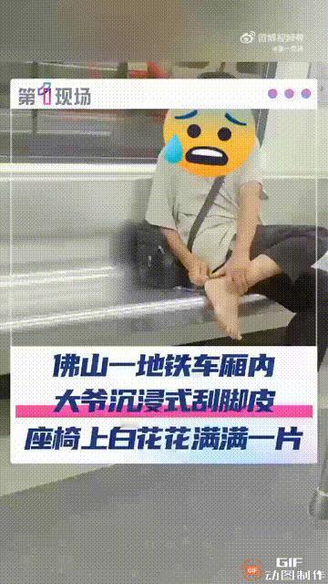 广东佛山一处地铁车厢内,一位大爷脱鞋踩在座位上,开始用刀片刮脚皮,导致座椅周围白